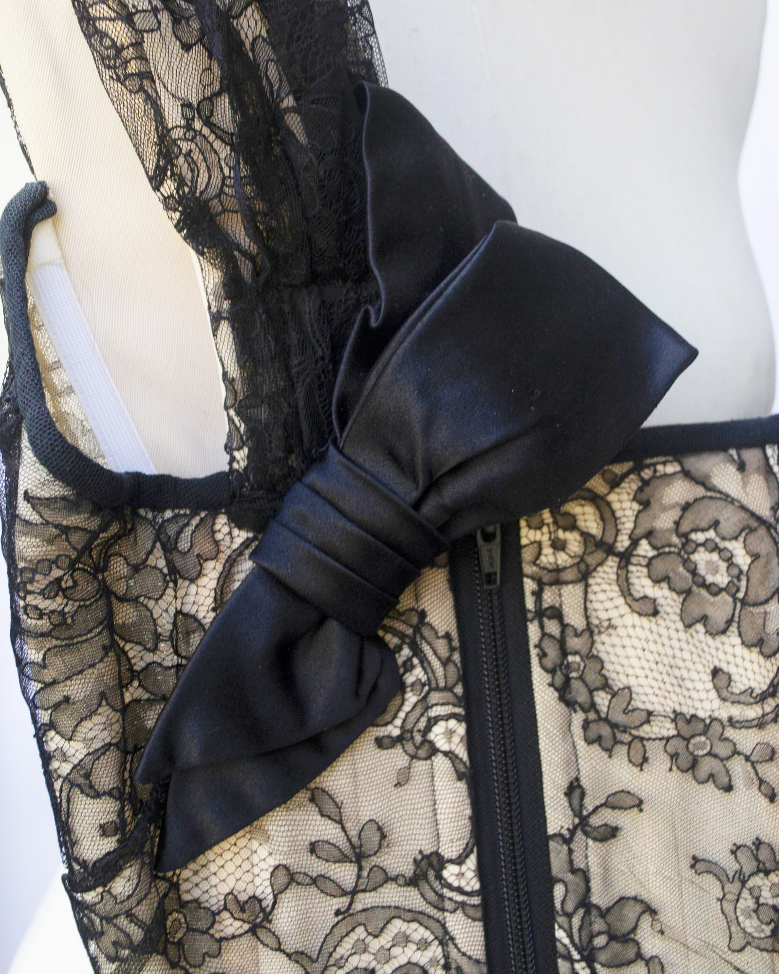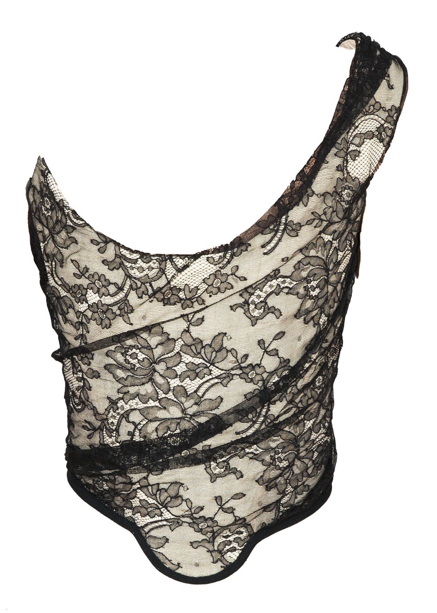 Corsetto aderente monospalla. In pizzo Valenciennes nero su fondo di corsetteria elastica color pelle, fiocco in seta sul retro. Anno 1996. Mai indossato. Taglia UK 10. Allacciatura centrale dietro con zip. Prodotto in Inghilterra. Eccellente stato.