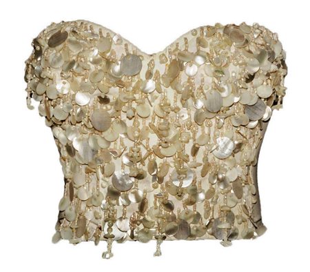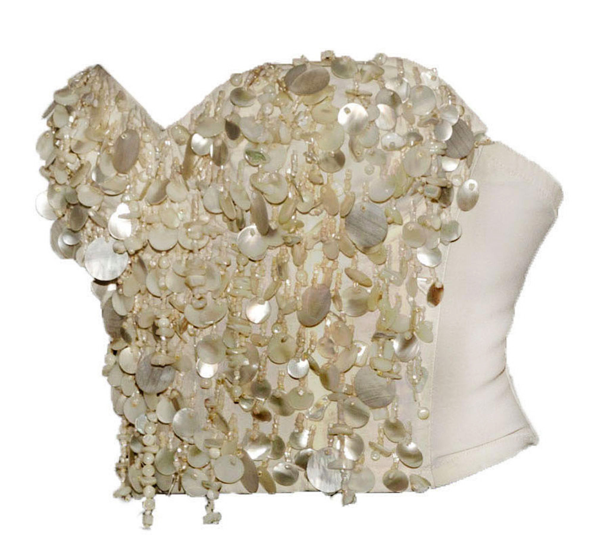 Raro corsetto da collezione del 1987. Fondo bianco completamente ricamato con paillettes in vera madreperla. Mai indossato. Taglia IT42, vestibilita' M, il tessuto di base e' corsetto elastico. Allacciatura centrale dietro con ganci. Made in Italy. Eccellente stato.