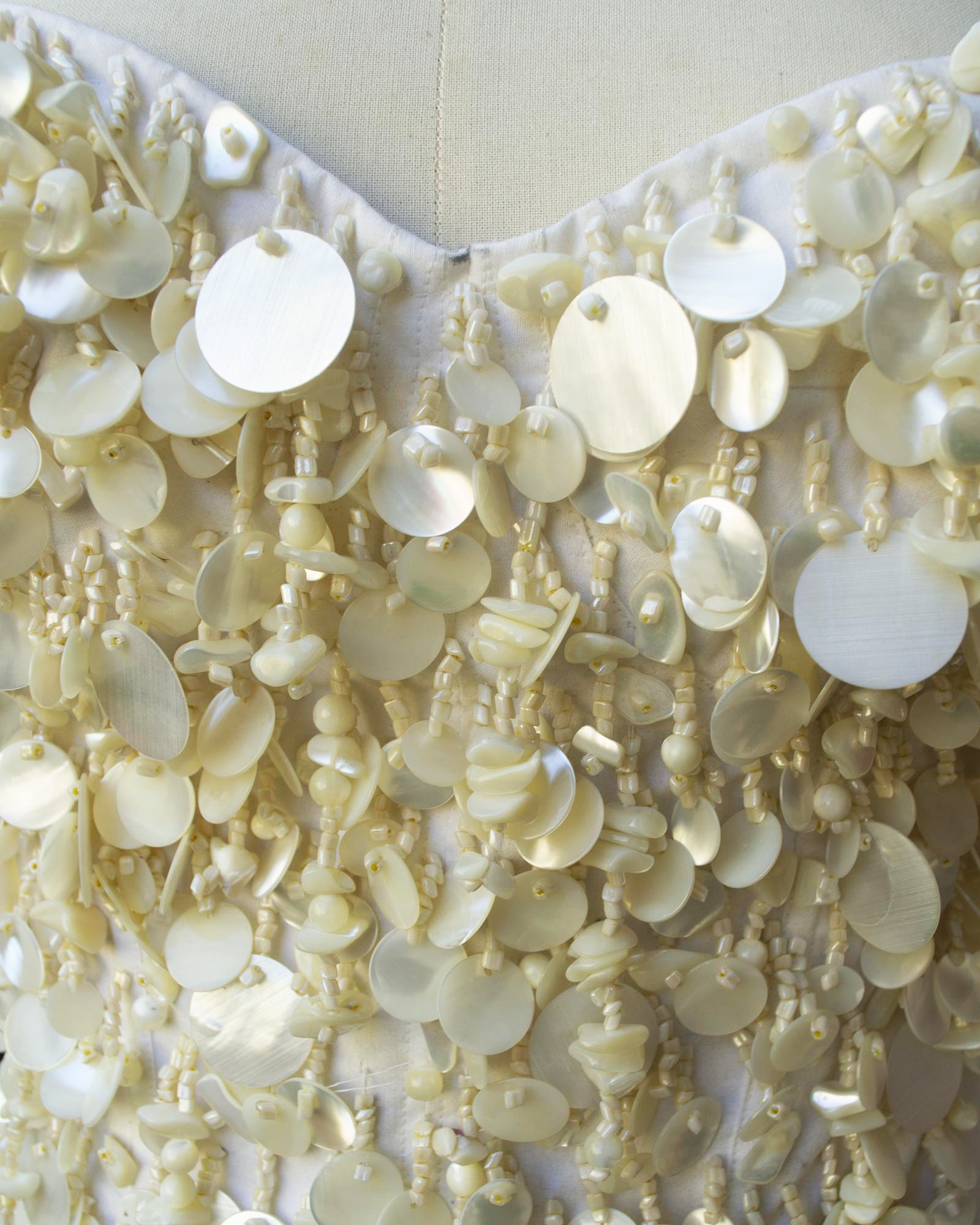 Rare collectible corset from 1987. White background completely embroidered with real mother-of-pearl sequins. Never worn. Size IT42, fit M, the basic fabric is elastic corsetry. Center back lacing with hooks. Excellent condition.
