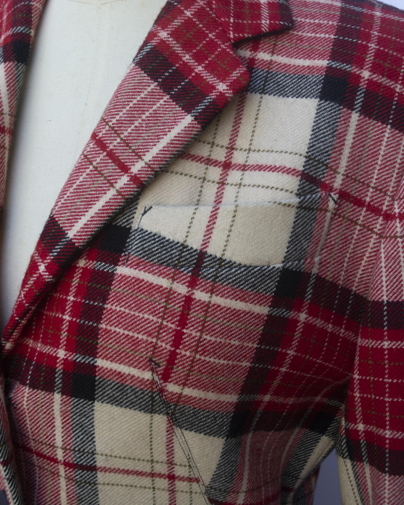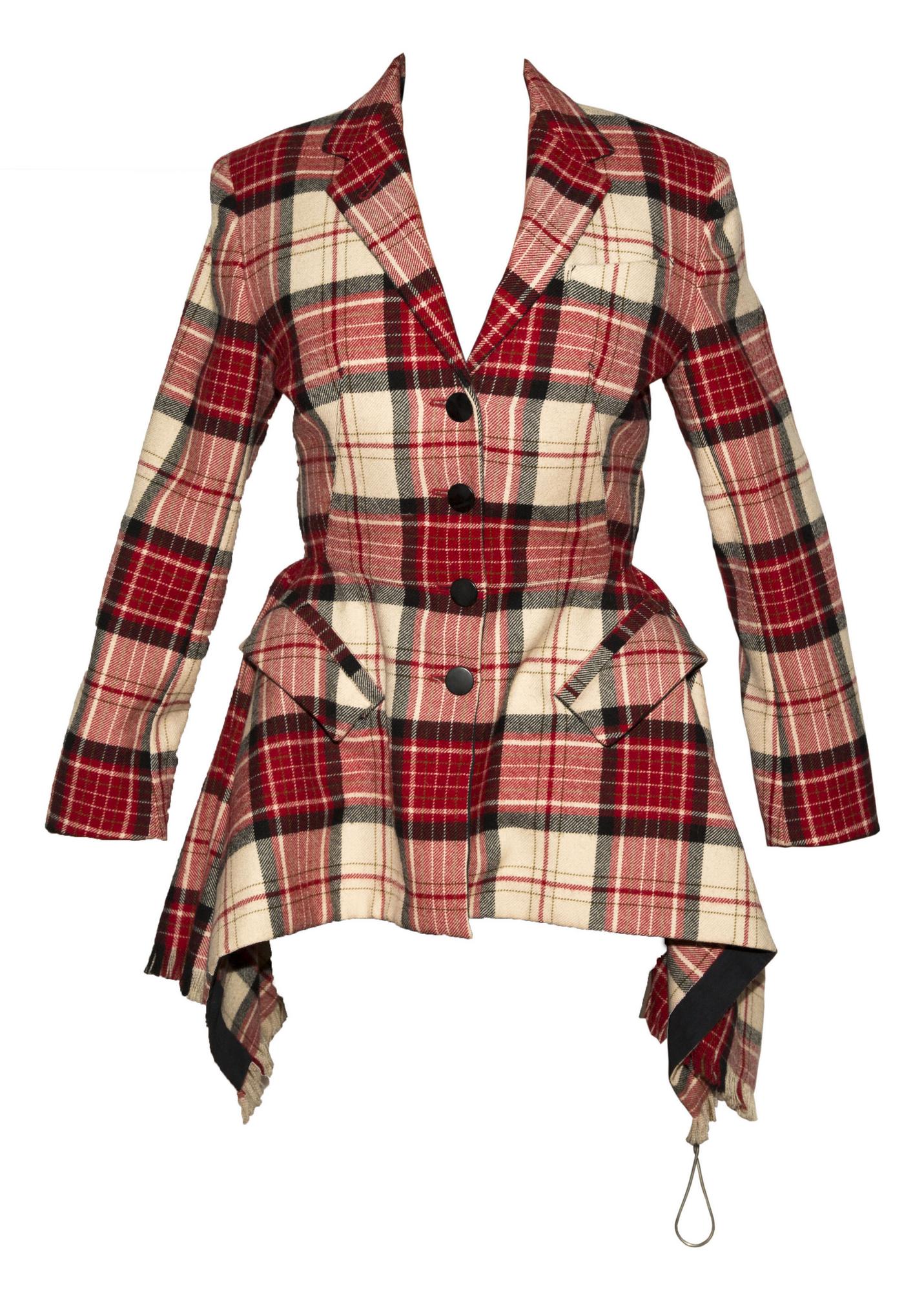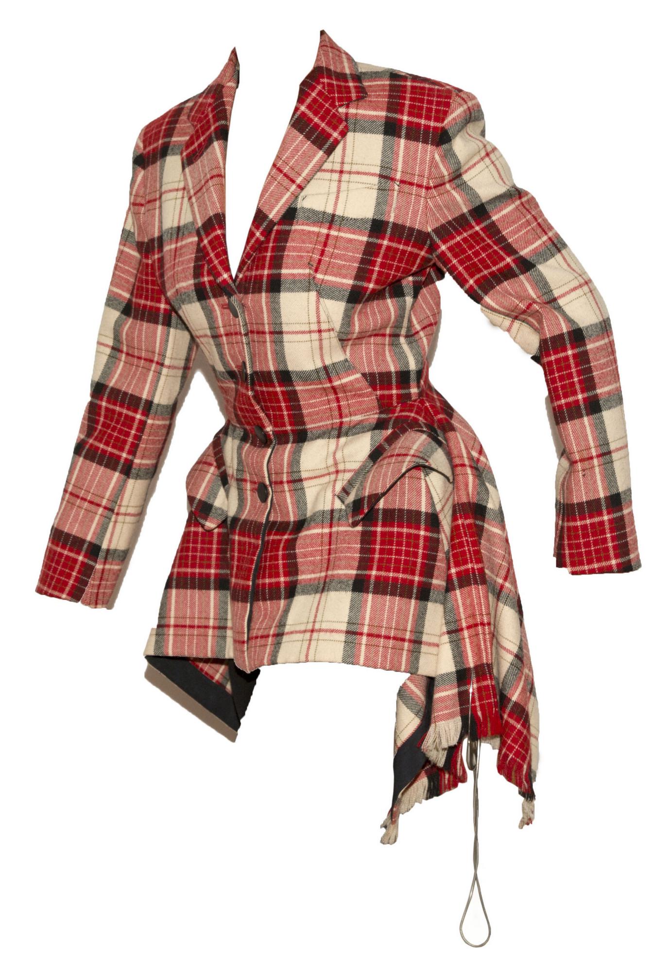 Giacca in Harris Tweed monopetto con tessuto tartan rosso, e'cru e nero. Baschina a fazzoletto con orli sfrangiati, che si possono fissare con l'accessorio spilla sul retro. Tasche con patta. Finiture interne in tessuto moire nero. Fodera nera. Collezione pret-a'-porter Autunno/Inverno 1991-92 denominata 'French Cancan.'. Modello raro. Taglia IT 42. Made in Italy. Perfettamente conservata.
