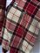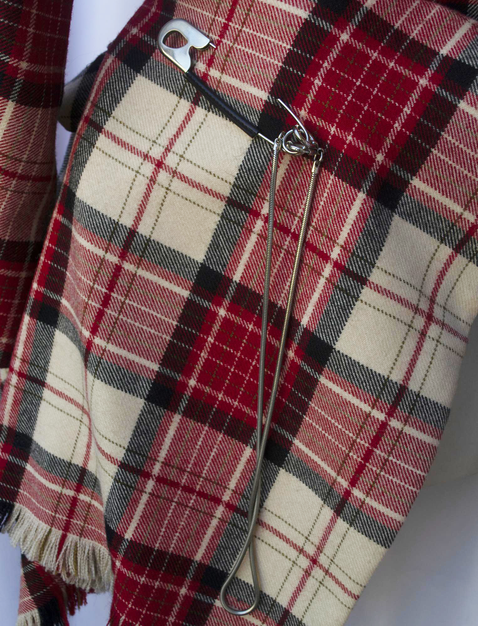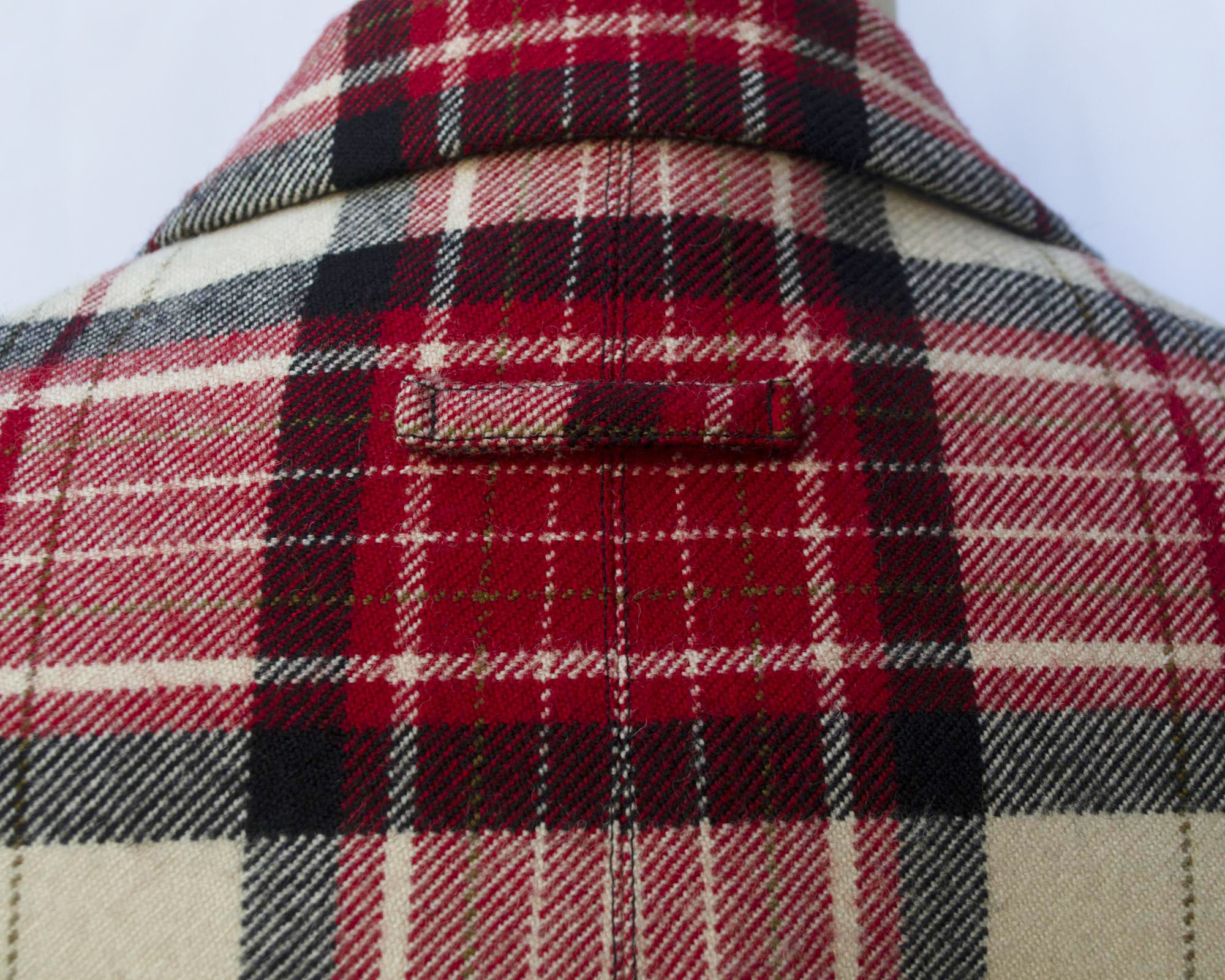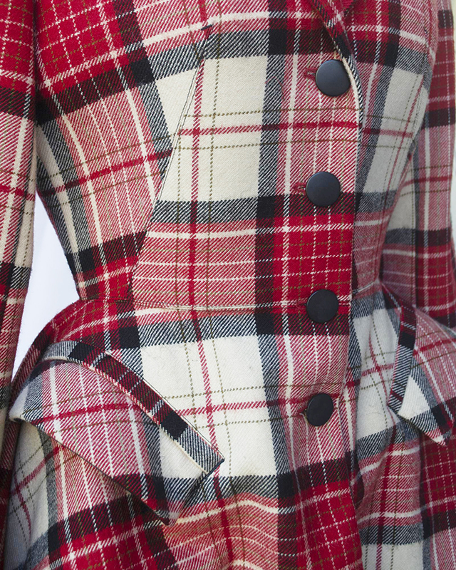 Giacca in Harris Tweed monopetto con tessuto tartan rosso, e'cru e nero. Baschina a fazzoletto con orli sfrangiati, che si possono fissare con l'accessorio spilla sul retro. Tasche con patta. Finiture interne in tessuto moire nero. Fodera nera. Collezione pret-a'-porter Autunno/Inverno 1991-92 denominata 'French Cancan.'. Modello raro. Taglia IT 42. Made in Italy. Perfettamente conservata.