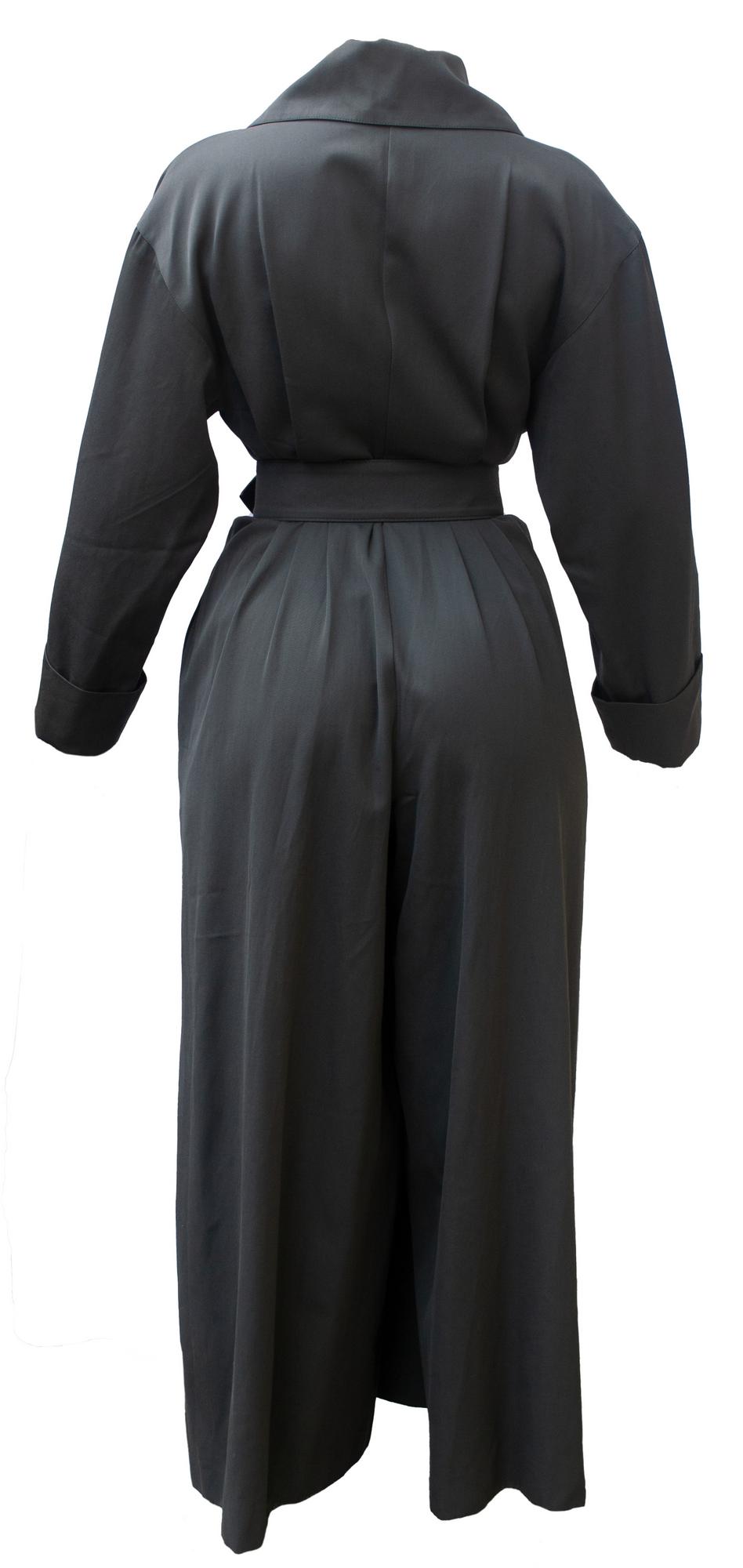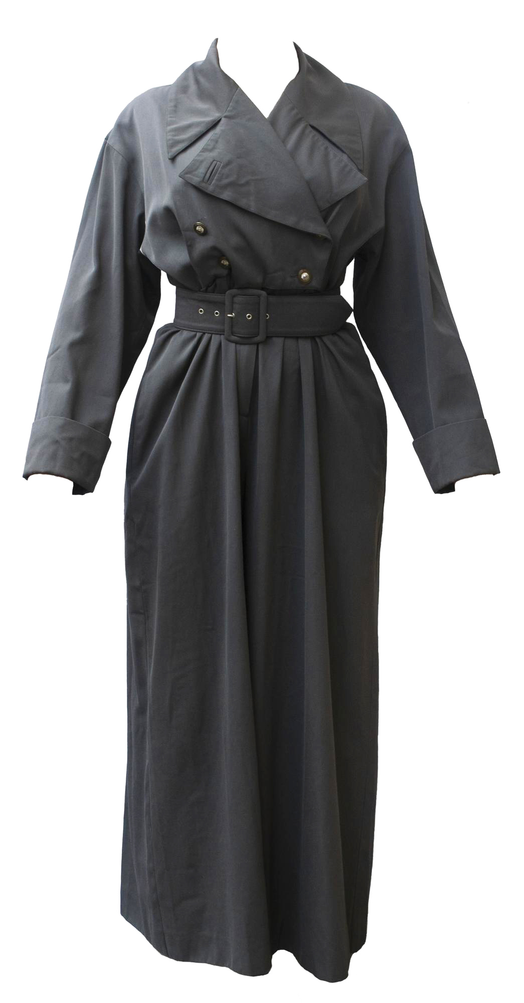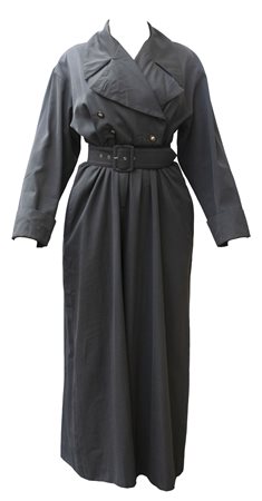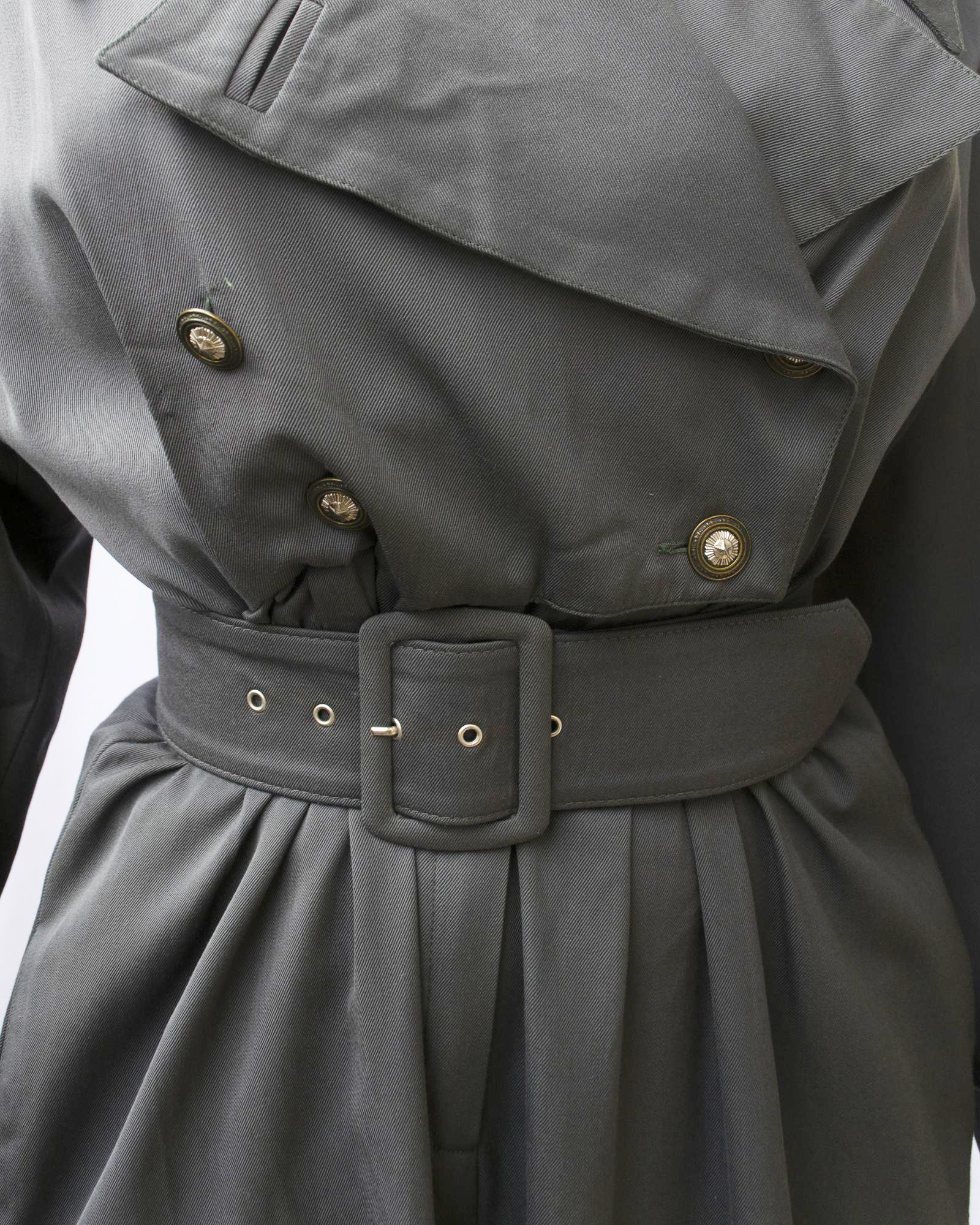 Military look for this petrol green gabardine overall with belt. Wide collar and trousers for a double breasted buttoning with metal buttons. Sleeves hem with turn up. Size IT 40. Made in Italy in the middle '80s. Perfectly preserved.