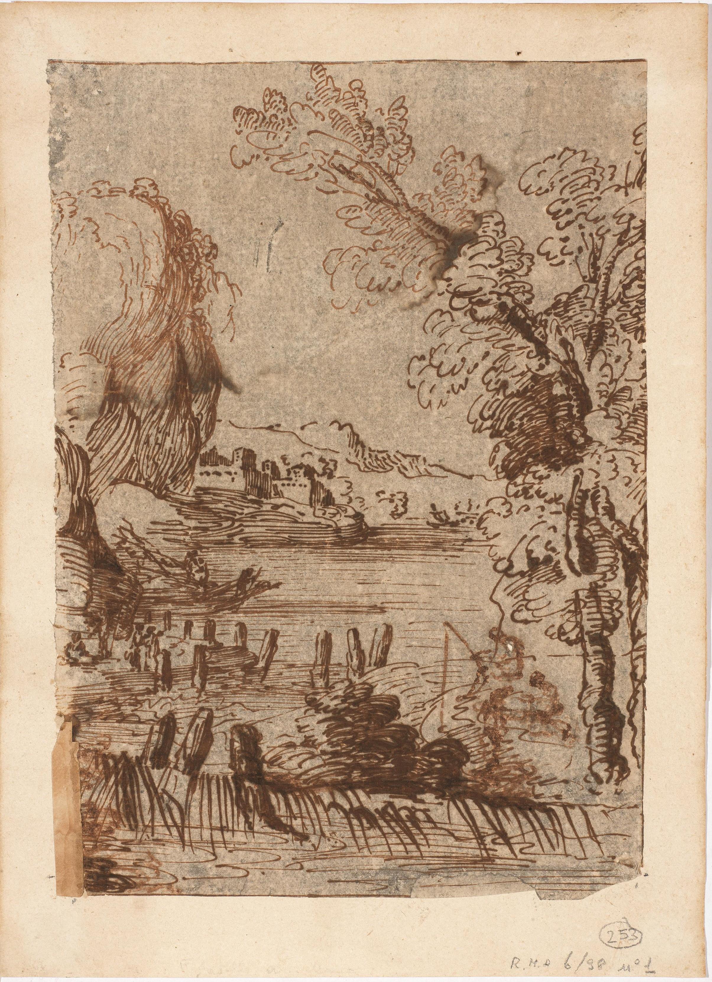 Il disegno è confrontabile con quelli della Pinacoteca Nazionale di Bologna: Paesaggio con alberi, case e figure (Inv. 1667) e Paesaggio con monti, alberi, case, fiume e figure (Inv. 1668) pubblicati e descritti in: M. Faietti / A. Zacchi, Figure. Disegni dal Cinquecento all’Ottocento nella Pinacoteca Nazionale di Bologna, MIlano 1998, pagg. 204/205.