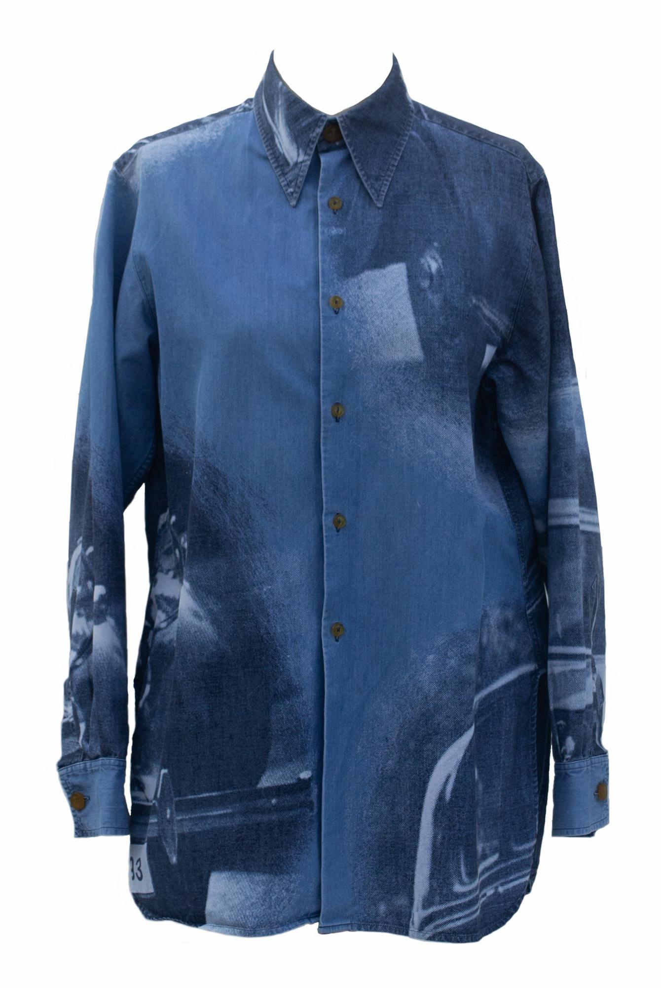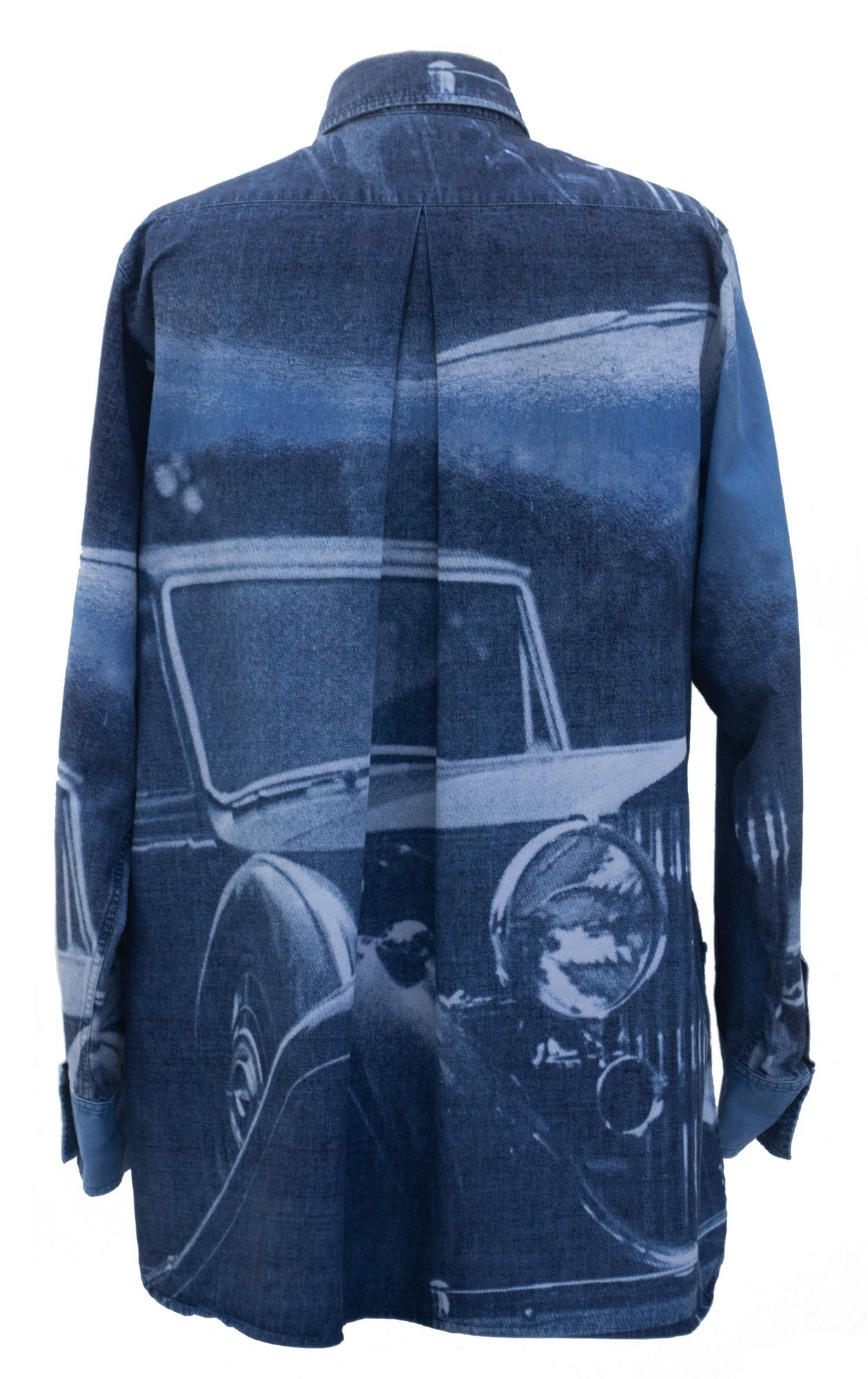 Iconic shirt with Rolls Royce photo print on indigo cotton. 'Always on Camera' Collection. Made in Ireland EU size 38 in 1992. Perfectly preserved.