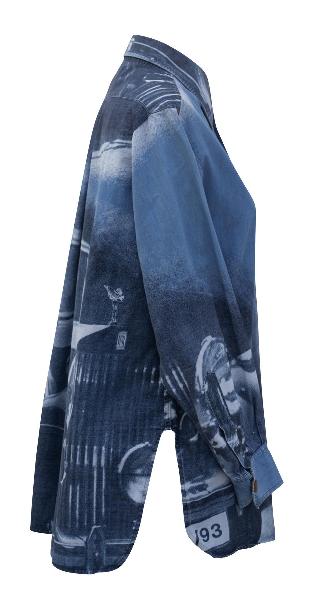 Iconica camicia con stampa fotografica Rolls Royce su cotone indaco. Collezione 'Always on Camera'. Prodotto in Irlanda taglia EU 38 nel 1992. Perfettamente conservato.