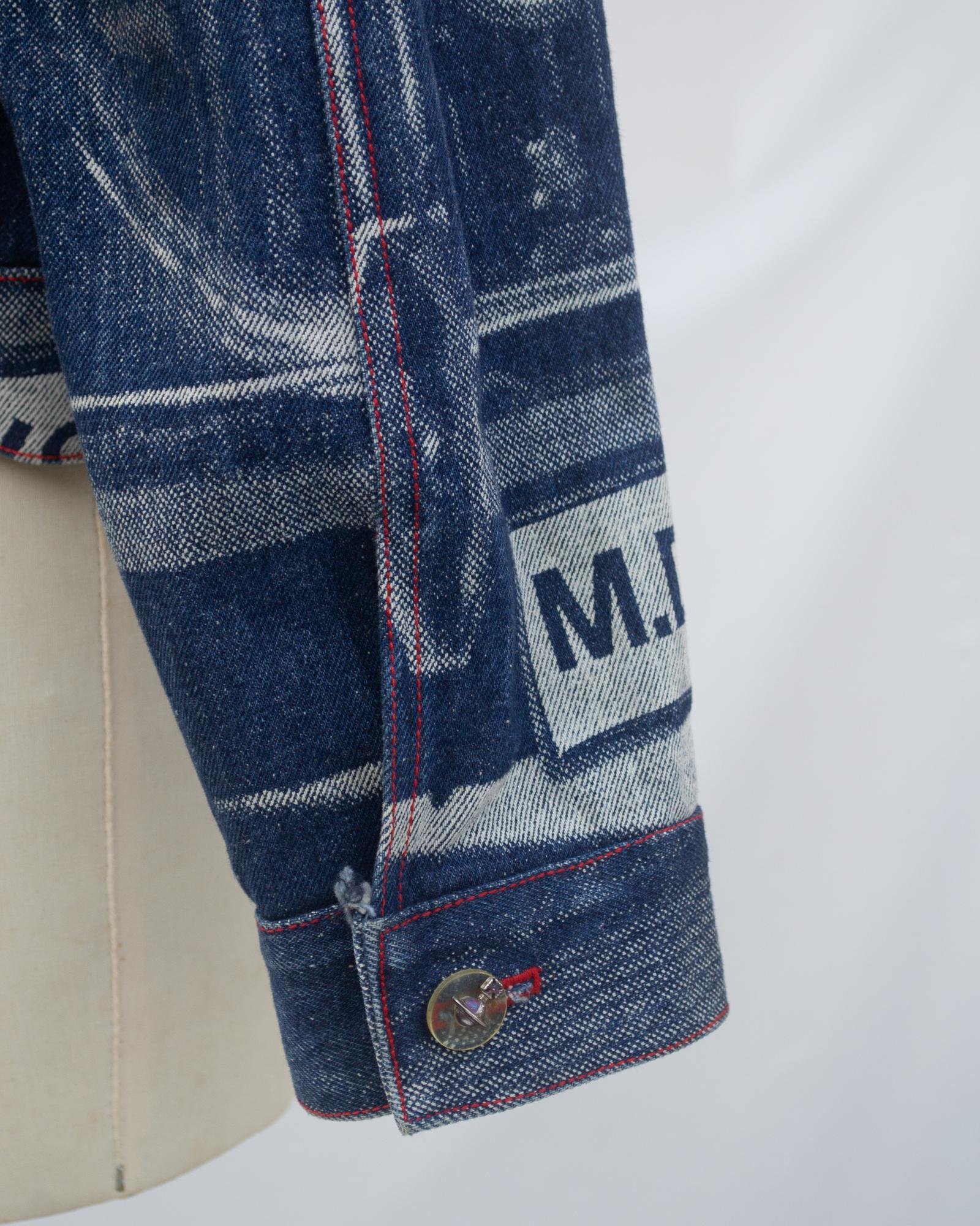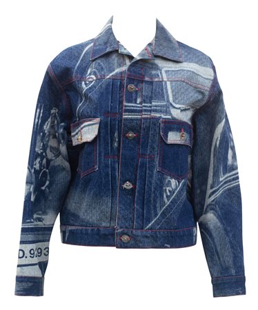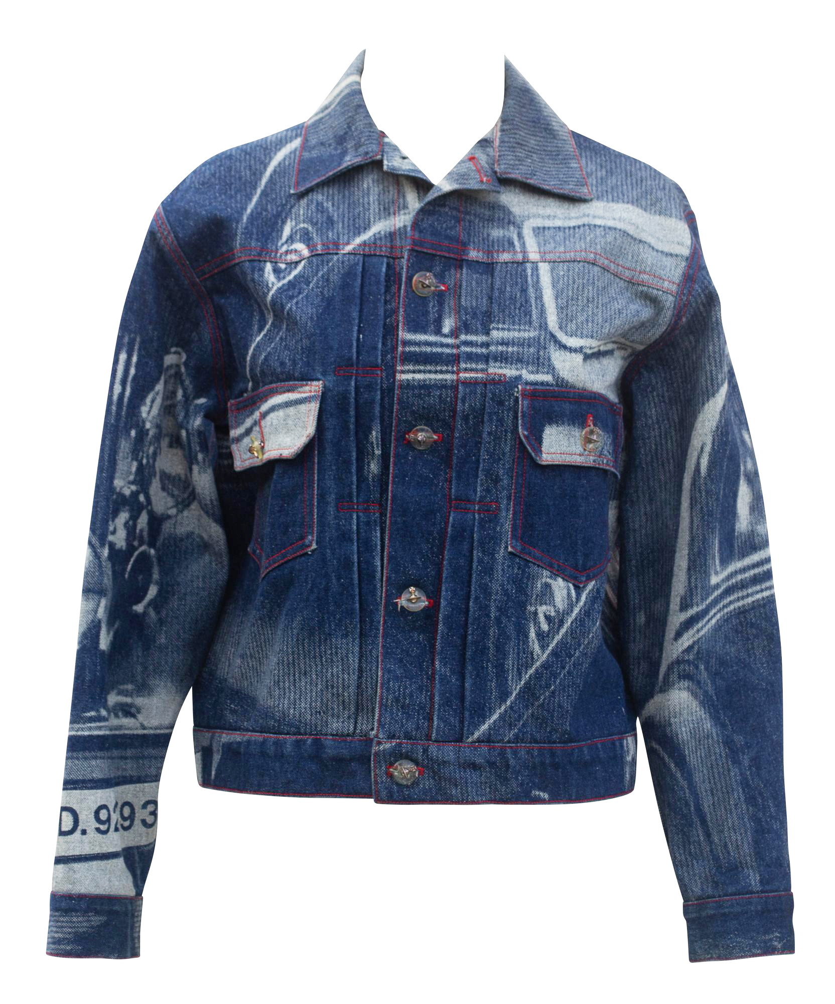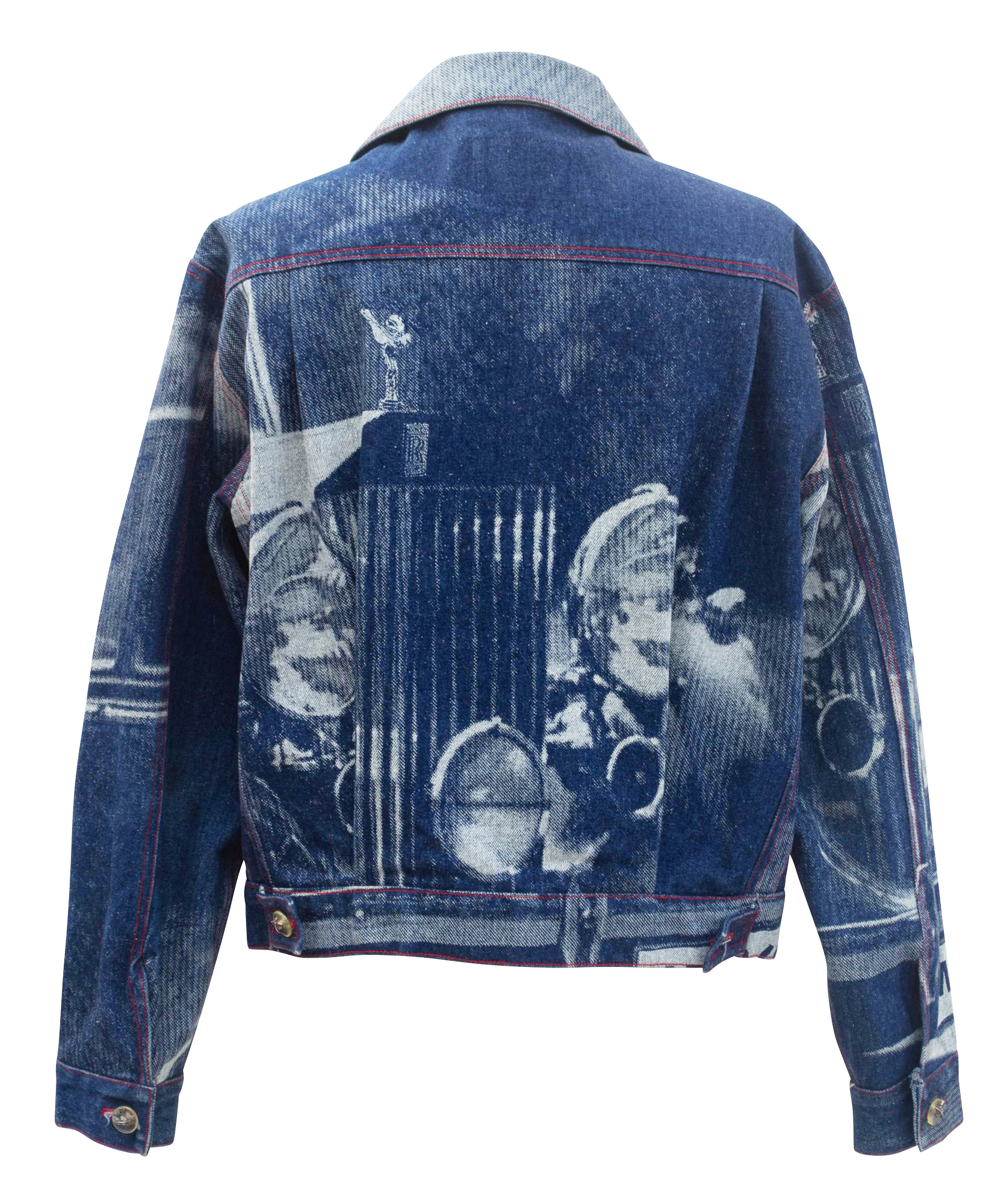 Iconica giacca in denim con stampa fotografica Rolls Royce con ricamo in rosso, bottone con Orb di metallo incassati. Della Collezione 'Always on Camera'. Prodotto in Inghilterra nel 1992. Taglia M. Ben conservato.
