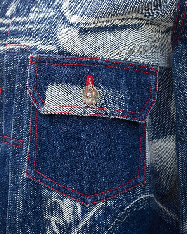 Iconic Rolls Royce photo print denim jacket top stiched in red. Perspex buttons with incased metal Orbs. From the 'Always on Camera' Collection. Made in England in 1992. Size M. Well preserved.