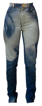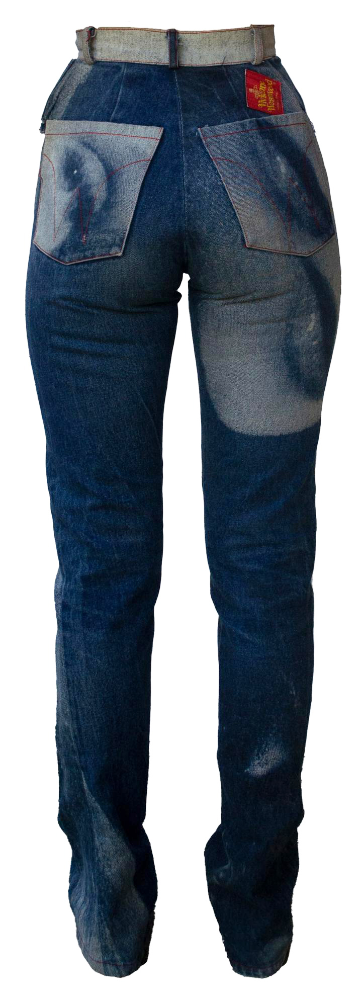 Pantalone in denim stampato Marlene Dietrich. Jeans slim fit e vita alta. Impunture in rosso. Bottone logo Orb. Collezione 'Always on Camera', Autunno-Inverno 1992. Made in England. Capo iconico di particolare interesse per collezionisti. Taglia UK 10. Ben conservato.