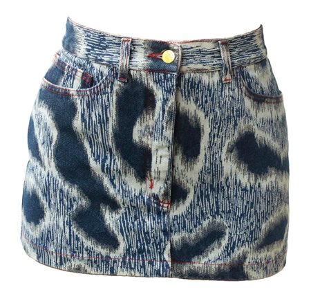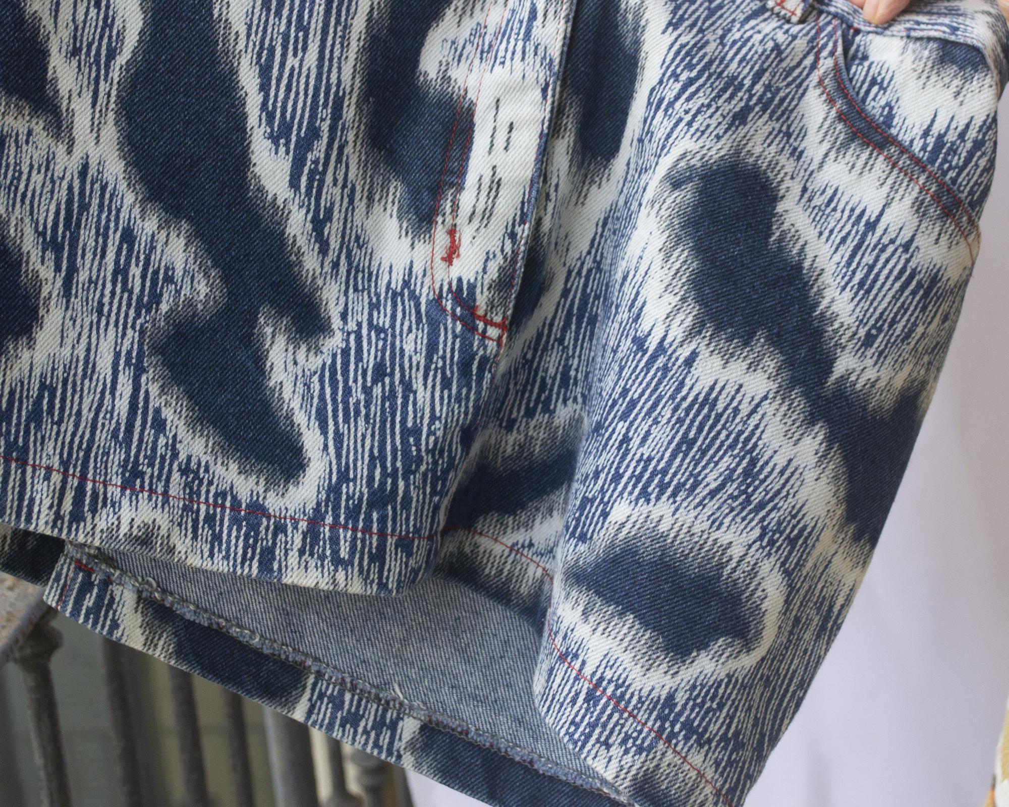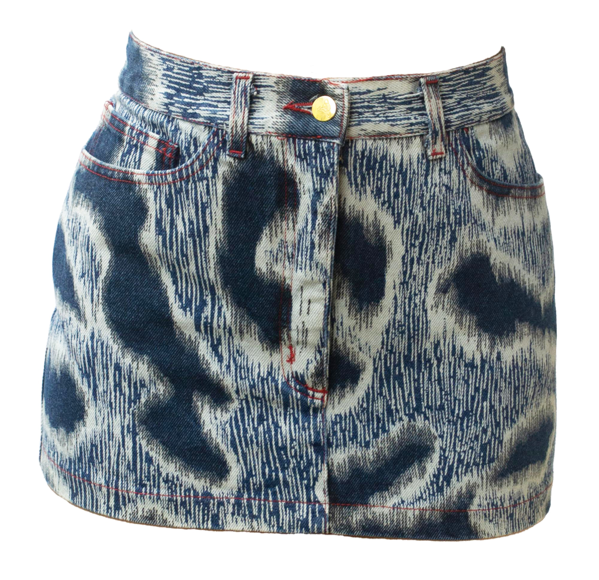 Leopard print denim for this mini skirt. Contrasting stitching in red. Made in Italy in the 90s. Size IT 42. Perfectly preserved.