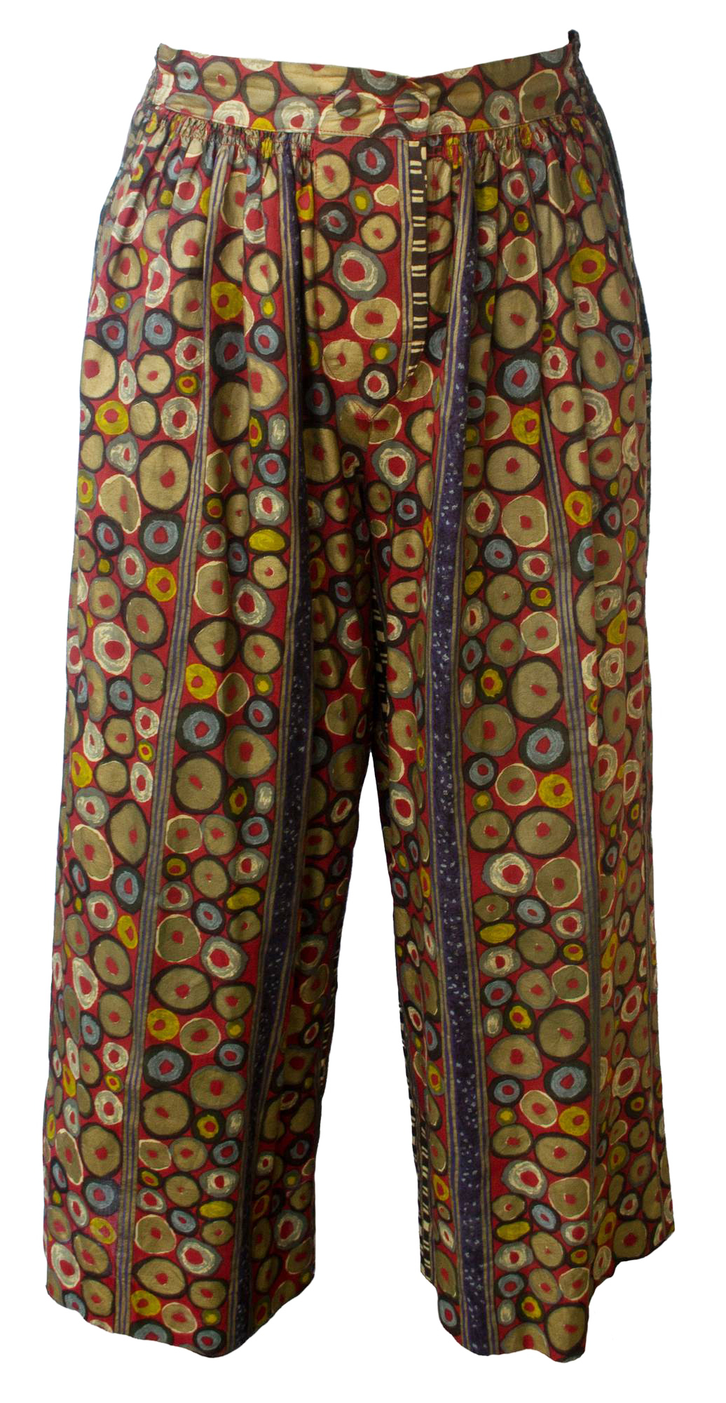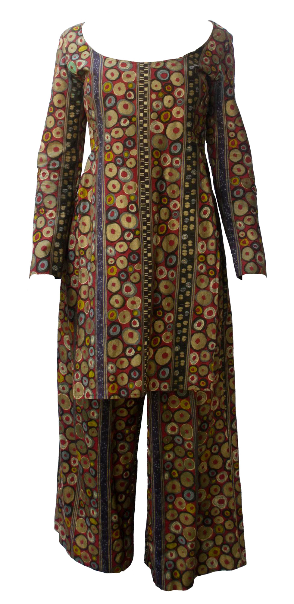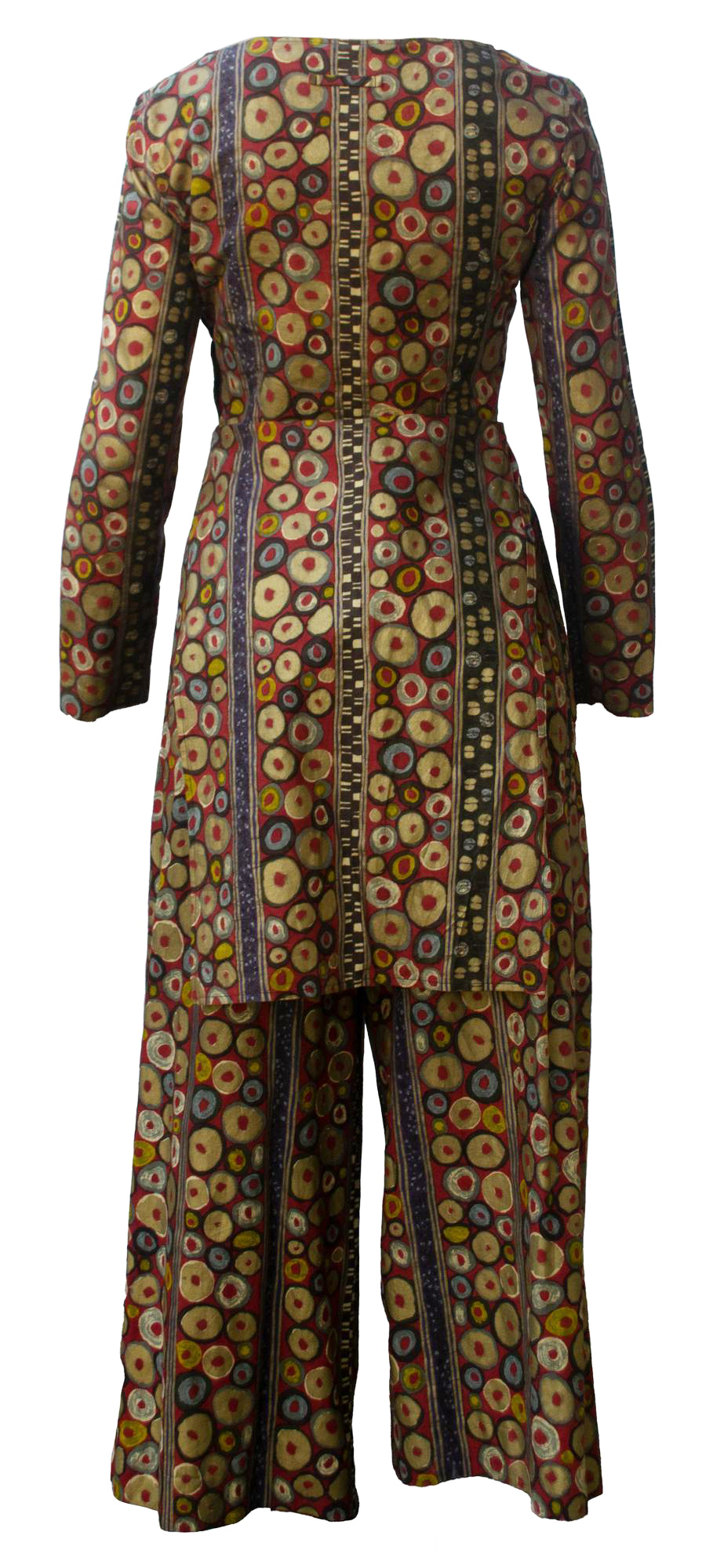 Un po' d'Africa, un po' ispirata a un quadro di Klimt e' questa stampa su cotone per questa tunica lunga con ampio scollo e allacciata sul fianco alto e un pantalone ampio, lungo fino alla caviglia e con cintura in vita ricamata in goffratura. I colori hanno un sapore bizantino, dall'oro al rosso rubino. grigio scuro intenso, viola e blu pallido. Prodotto in Italia nei primi anni '80. Taglia IT 42. Ben conservato.