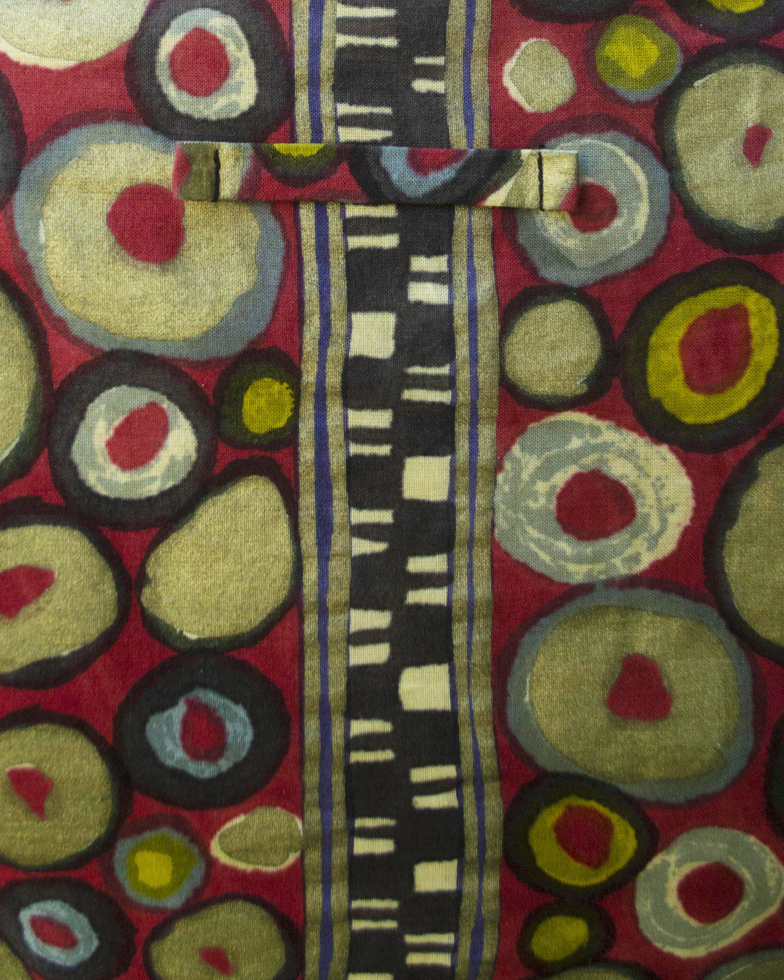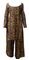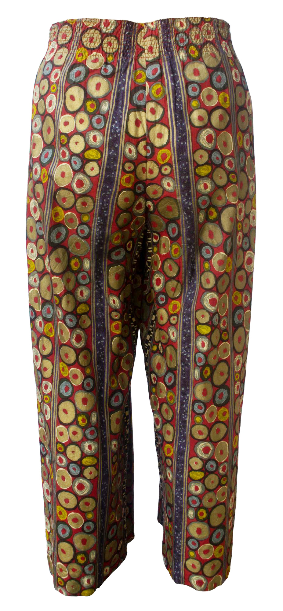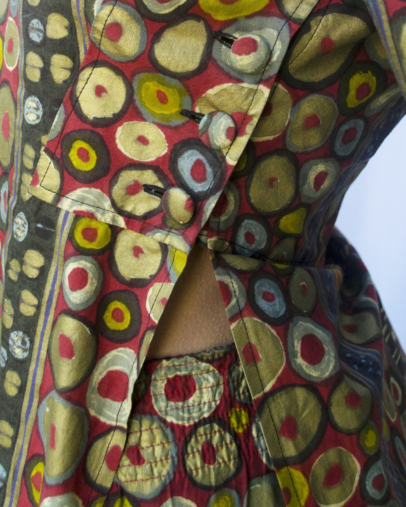 Un po' d'Africa, un po' ispirata a un quadro di Klimt e' questa stampa su cotone per questa tunica lunga con ampio scollo e allacciata sul fianco alto e un pantalone ampio, lungo fino alla caviglia e con cintura in vita ricamata in goffratura. I colori hanno un sapore bizantino, dall'oro al rosso rubino. grigio scuro intenso, viola e blu pallido. Prodotto in Italia nei primi anni '80. Taglia IT 42. Ben conservato.