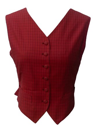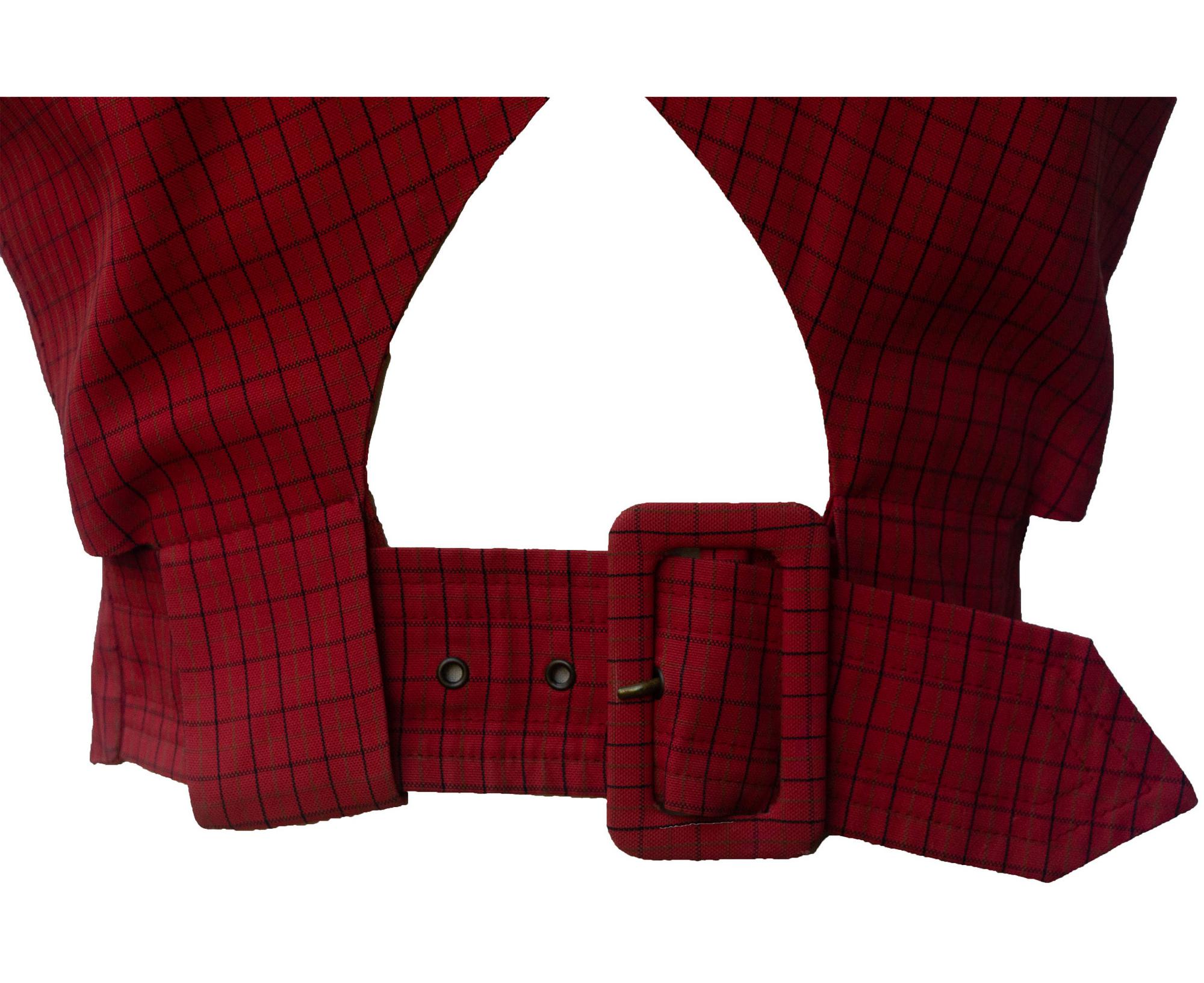Tessuto rosso tattersall per questo gilet. Classico davanti ma con una sorprendente schiena scoperta, si chiude con una grande fibbia rivestita in tessuto. Bottoni ricoperti in tessuto al centro davanti. Due tasche a filetto. Made in Italy meta' anni '80. Taglia italiana 42. Perfettamente conservato.