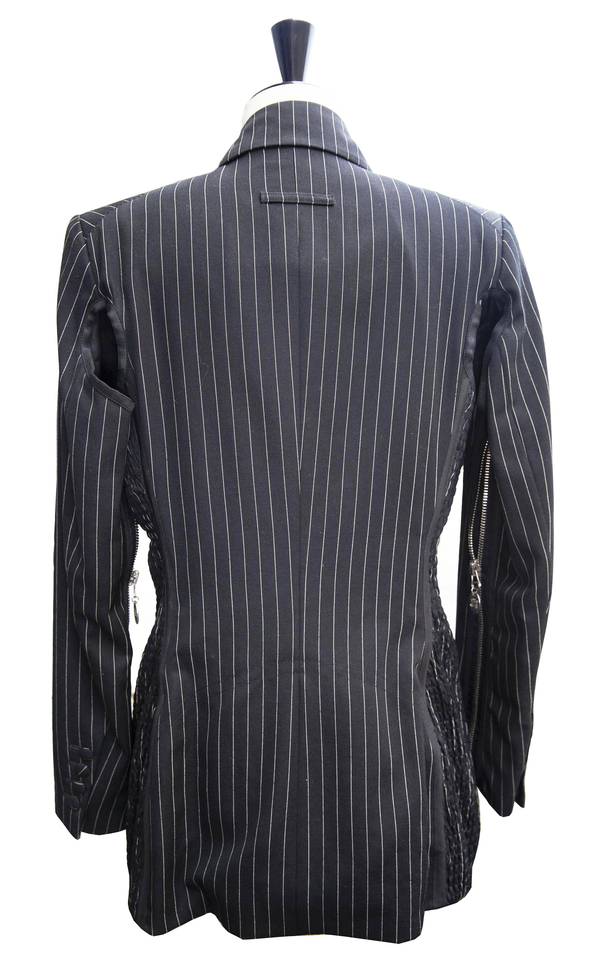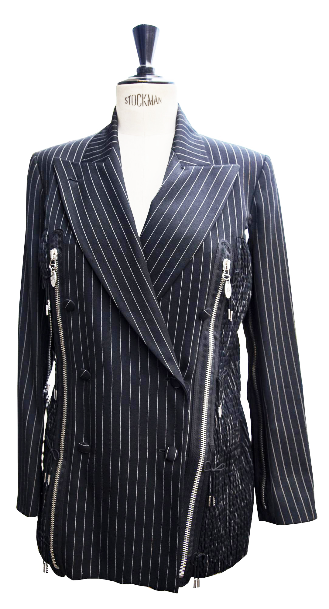 Lined double-breasted jacket made in black pinstripe wool. The long zips, with custom pullers that run along the length of the garment and sleeves, give it a strong look. Embossed and finished embroidery with trimming details, on both sides of the body lenght. Made in Italy. Size IT 42. Well preserved.