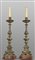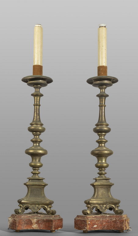 Coppia di grandi candelieri Luigi XIV in bronzo poggianti su basi in legno laccato, sec. XVII