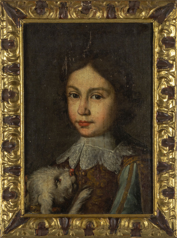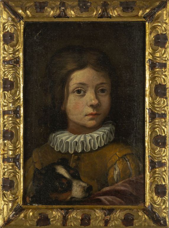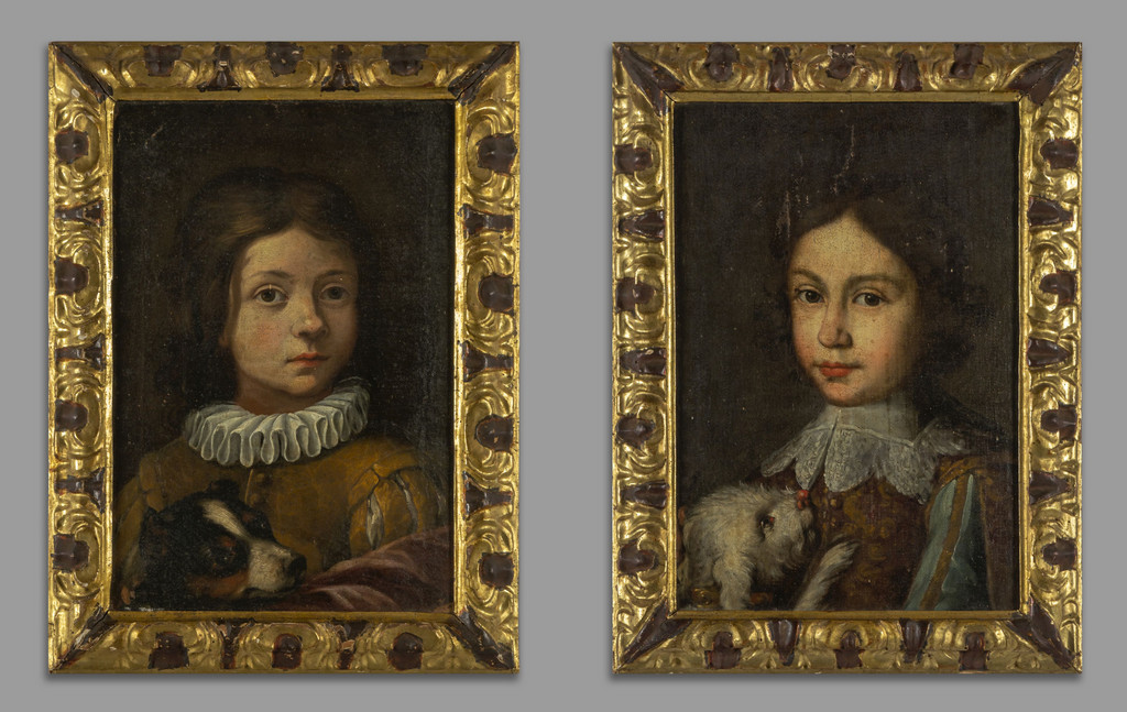 "Ritratti di fanciulli con cani" coppia di olii, cornici coeve in legno intagliato e dorato