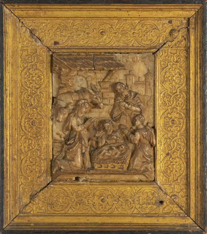 Natività, placca in alabastro,cornice coeva in legno intagliato e dorato,