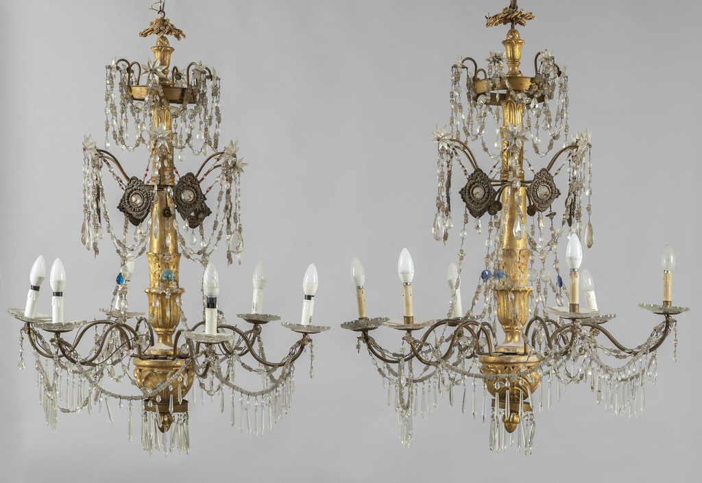 Coppia di lampadari Luigi XVI a sei luci in legno intagliato e dorato con ricca applicazione di cristalli, Genova fine sec.XVIII/inizi sec.XIX