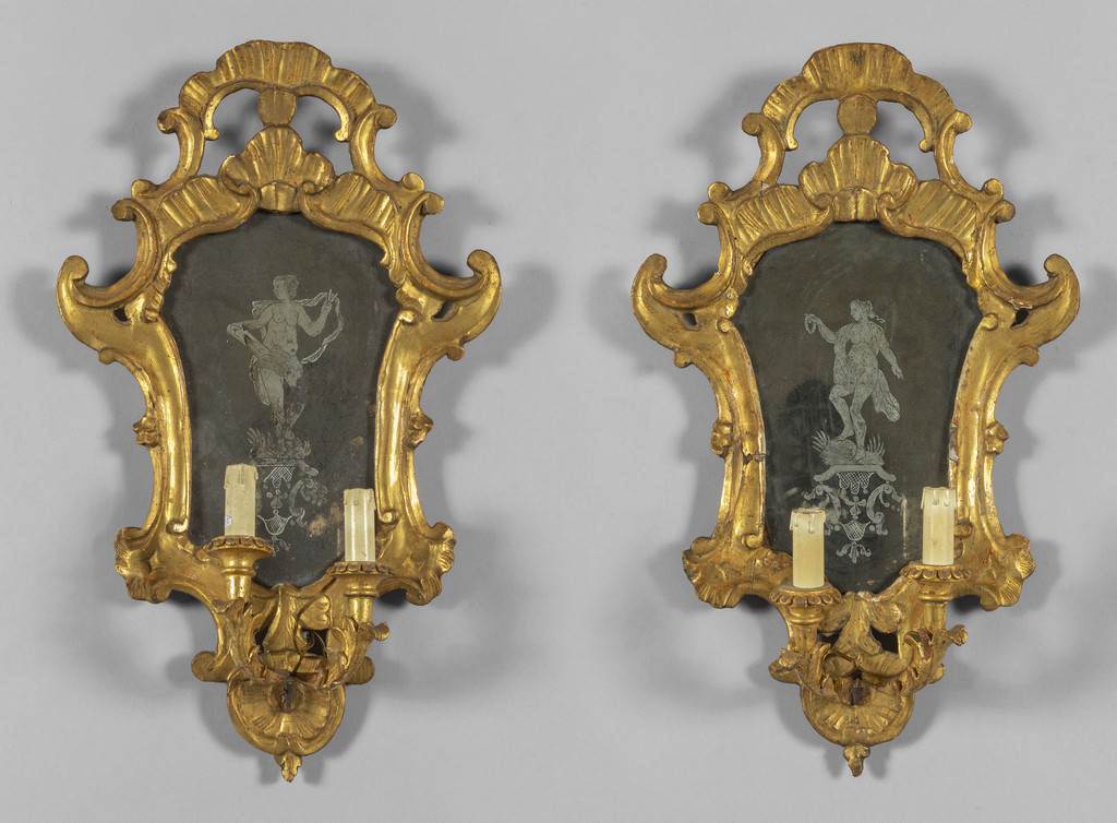 Coppia di specchierine Luigi XV in legno intagliato e dorato, specchi incisi, Venezia sec.XVIII