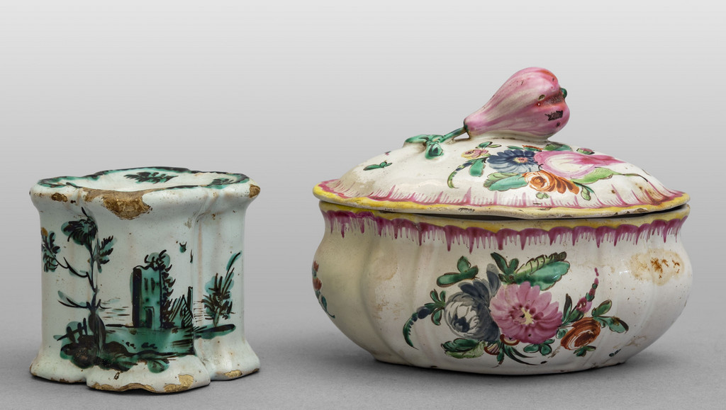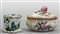 # Zuccheriera in ceramica, decorazione alla rosa su fondo bianco e spargizucchero in ceramica, decorazione a paesaggi su fondo verde,