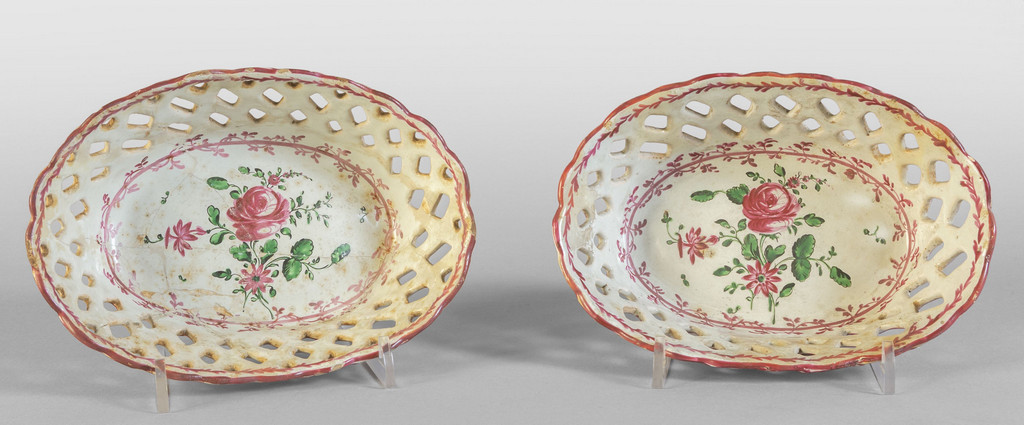 # Coppia di cestini in ceramica, decorazione alla rosa su fondo bianco, Lodi sec.XVIII