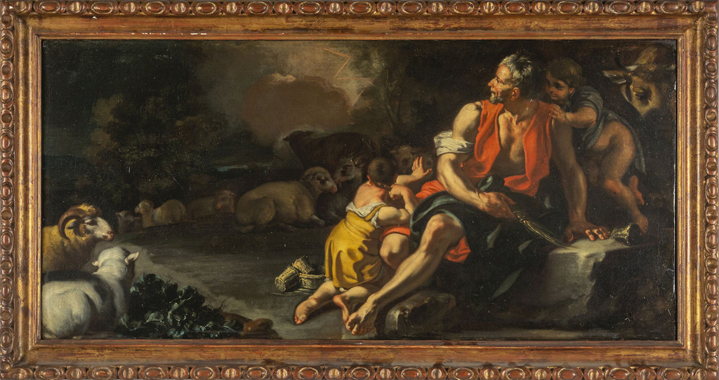 Scuola napoletana sec.XVII "Pastore con bambini e pecore" olio