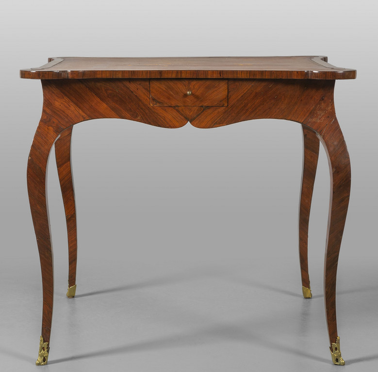 Tavolo da gioco Luigi XV lastronato in palissandro e bois de rose, quattro cassetti nella fascia, Genova metà sec.XVIII