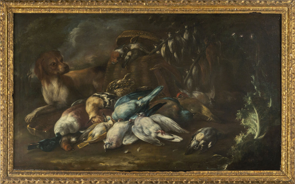 Scuola napoletana sec.XVII (Baldassare De Caro, Napoli 1689-1750) "Cane e cacciagione" olio