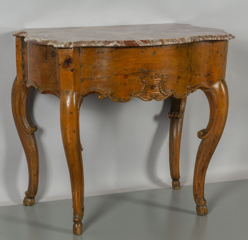 # Console Luigi XIV in legno intagliato e dorato, piano in breccia, sec.XVIII