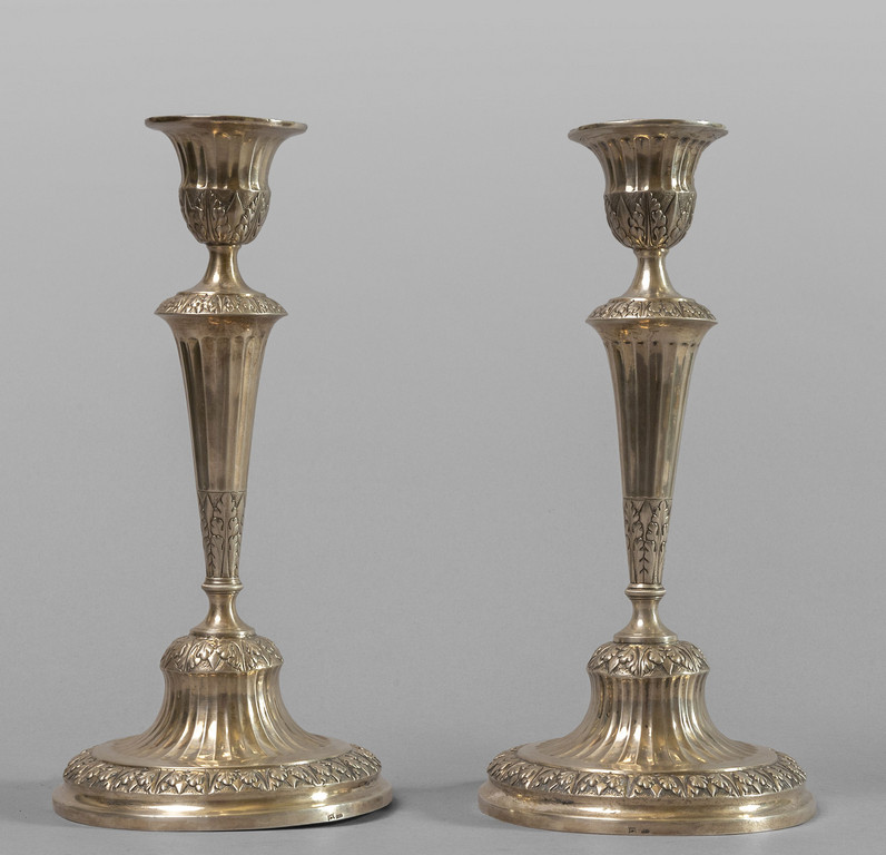 Lotto 0100 | # Coppia di candelieri in argento sbalzato,