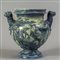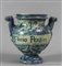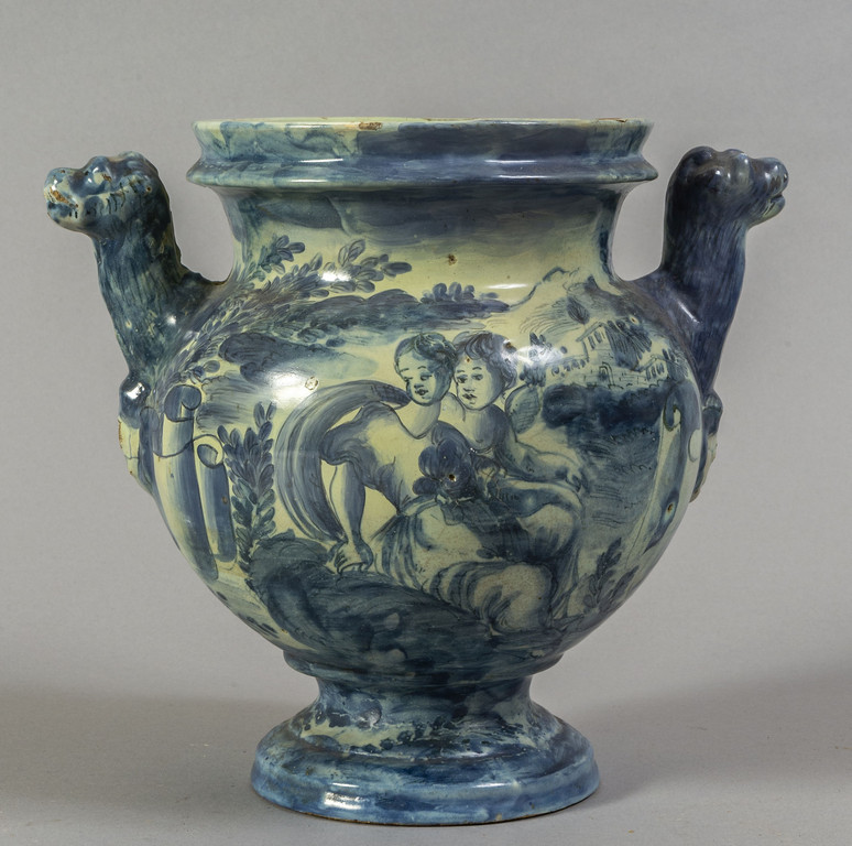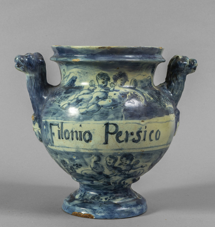 Vaso in ceramica decorato in blu su fondo bianco con putti, scritta medicinale FILONIO PERSICO, marca Lanterna, Savona sec.XVIII
