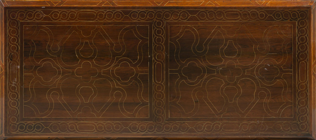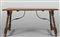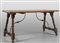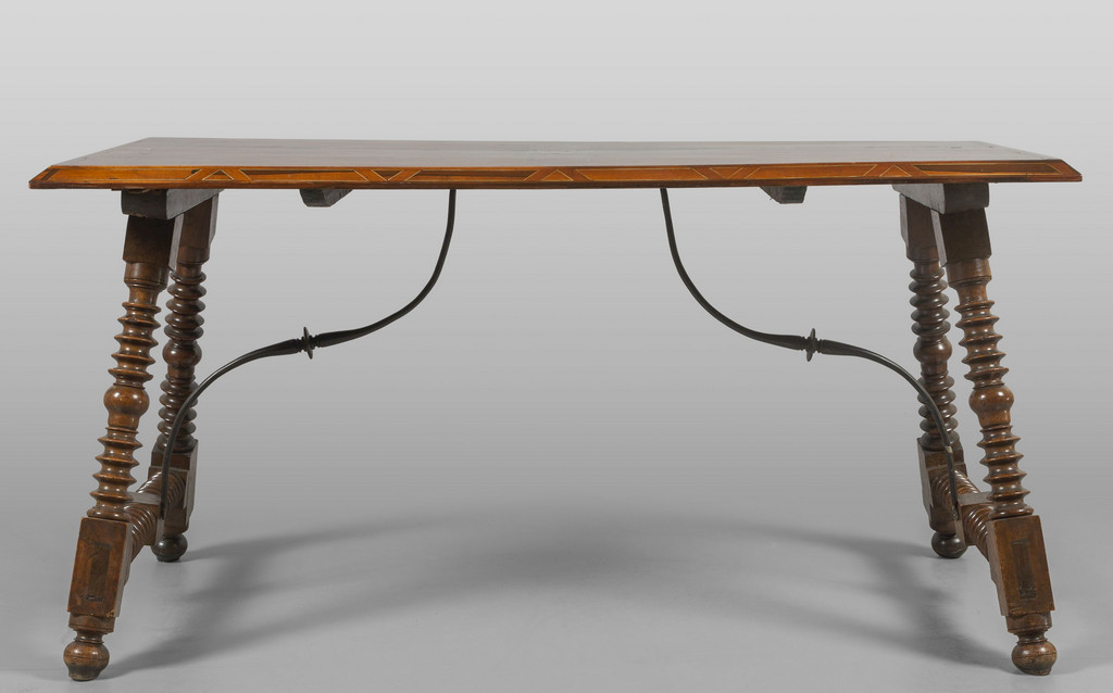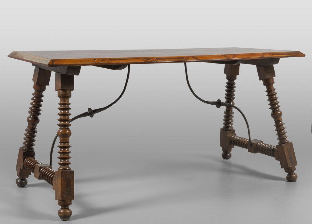 Tavolo a fratina, piano lastronato e intarsiato in osso, gambe a rocchetto raccordate da traverse in ferro, Spagna sec.XVIII