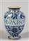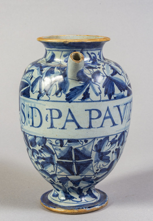 Brocca in ceramica, decorazione a fogliame blu su fondo azzurro, scritta medicinale S.D.PAPAVE, Roma sec.XVIII