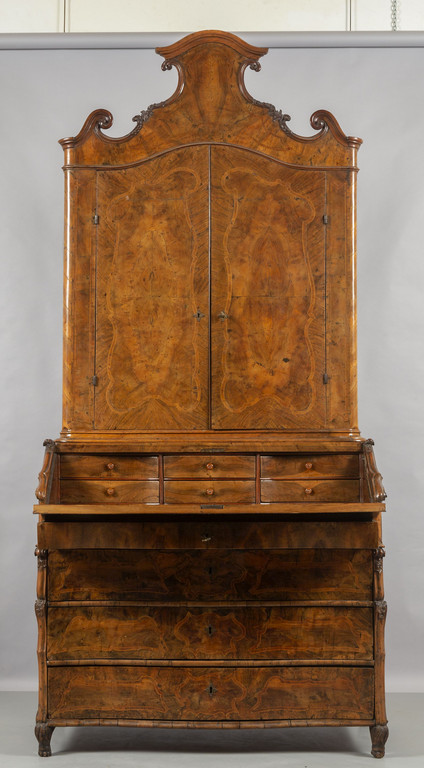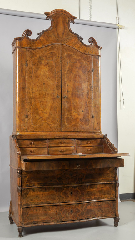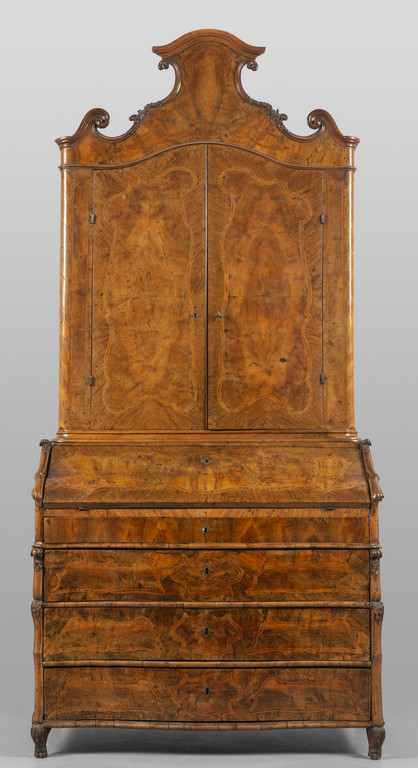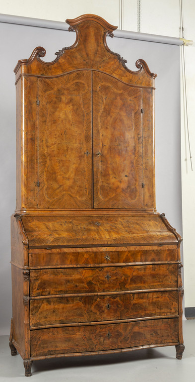 Doppio corpo Luigi XV lastronato in noce e radica di noce, parte superiore a due sportelli, parte inferiore con quattro cassetti e calatoia, Lombardia metà sec.XVIII