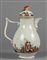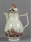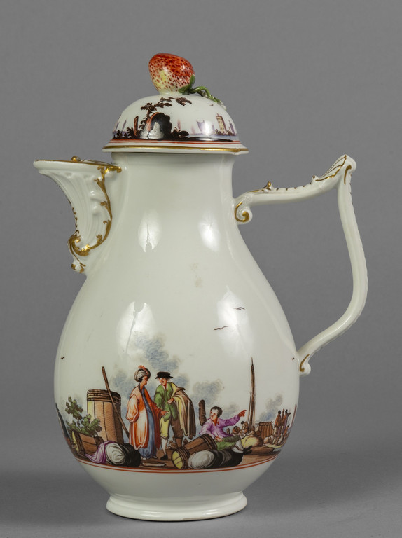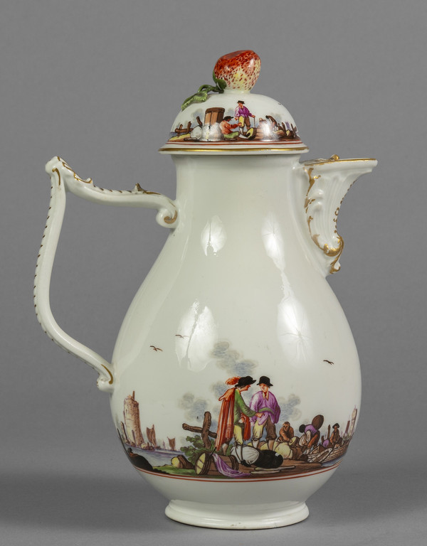Caffettiera in porcellana di Meissen decorata con scene di genere e fiori, marcata alla base, metà sec. XVIII
