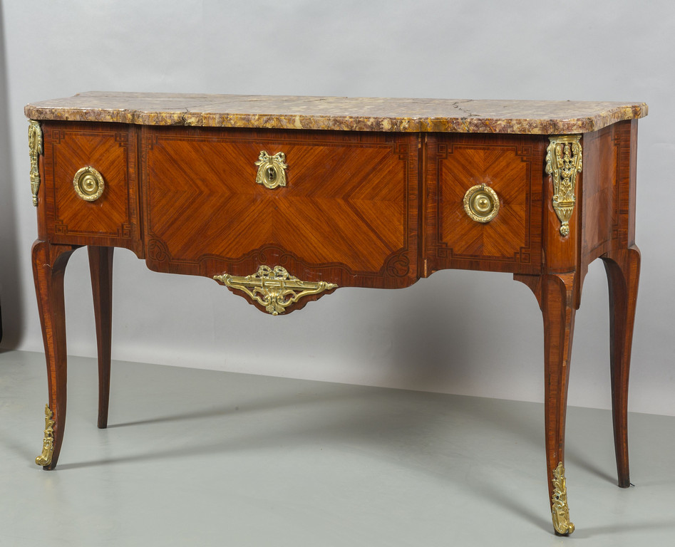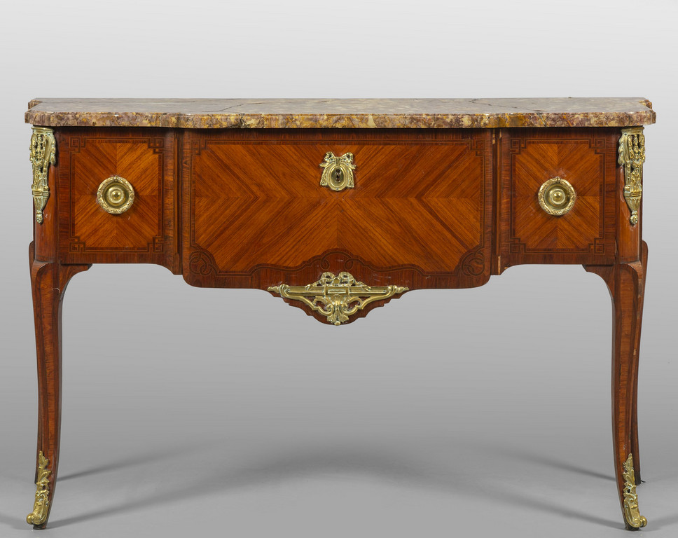 Tavolo a servant in stile Luigi XIV movimentato sul fronte e sui fianchi, lastronato in palissandro e bois de rose, Francia sec.XIX