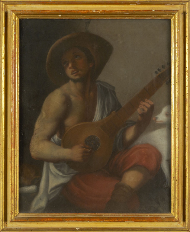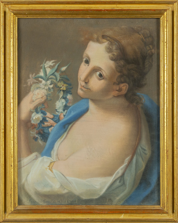 Maria Saracini Gori "Primavera" e "Menestrello" coppia di pastelli, d.ti 1741, cornici coeve in legno dorato