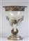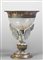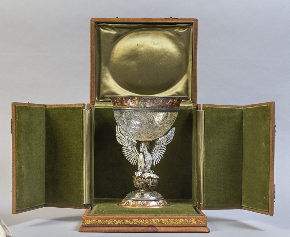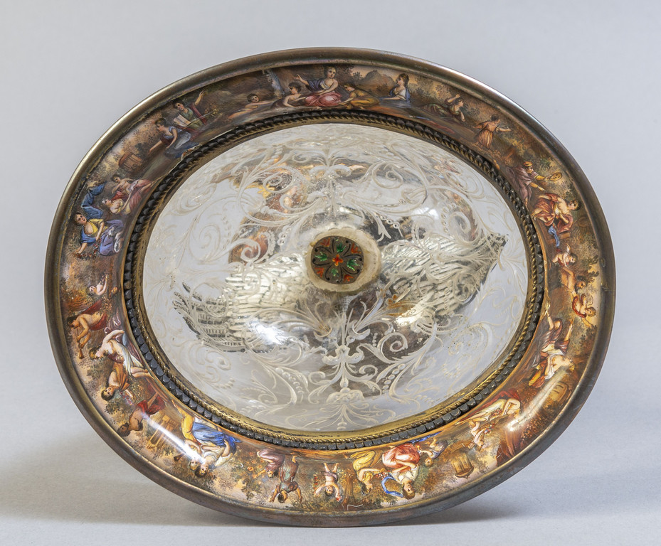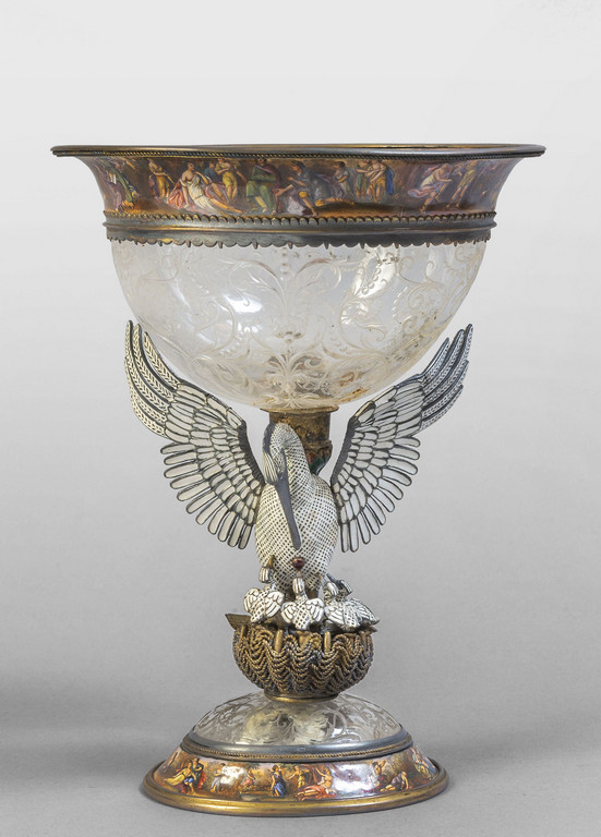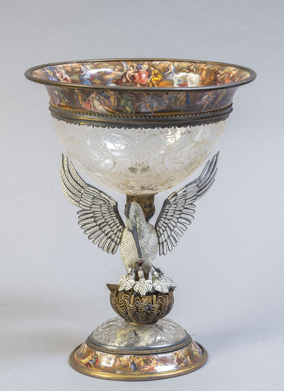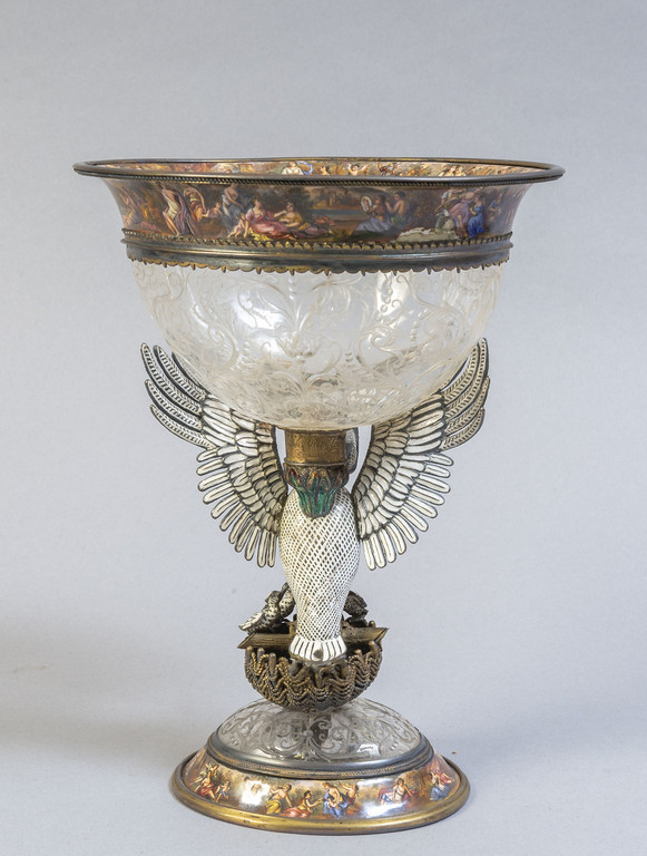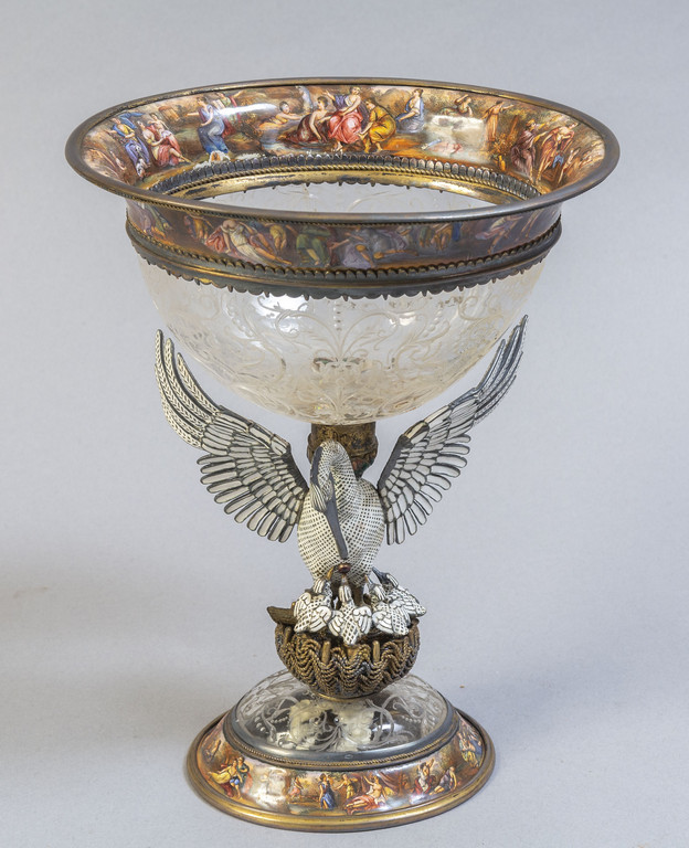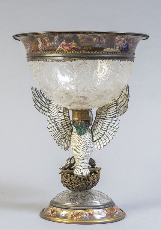 # Importante coppa in cristallo di rocca inciso con bordo in argento e smalti colorati raffiguranti scene neoclassiche, sostenuta da un'aquila in smalto che poggia su base in cristallo e smalti, Austria sec.XIX