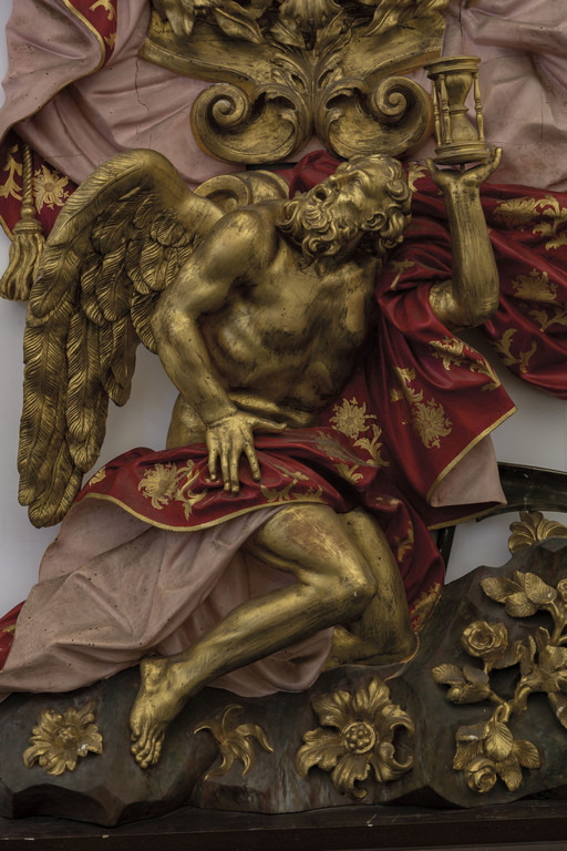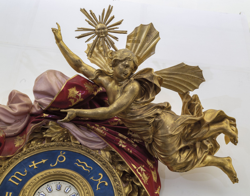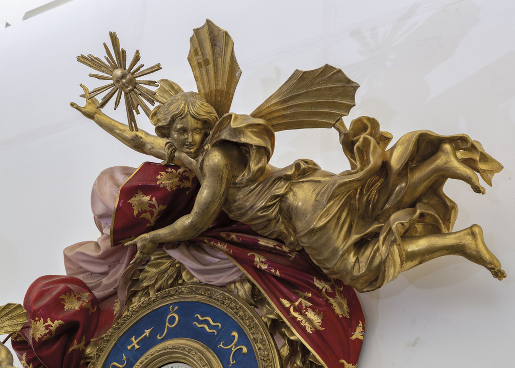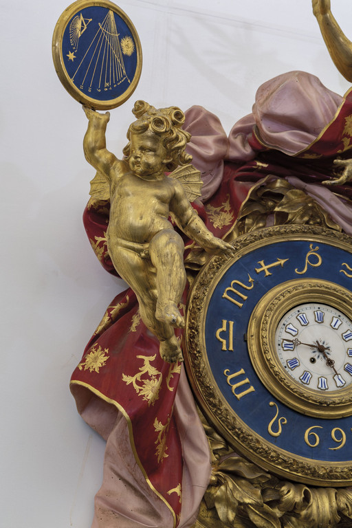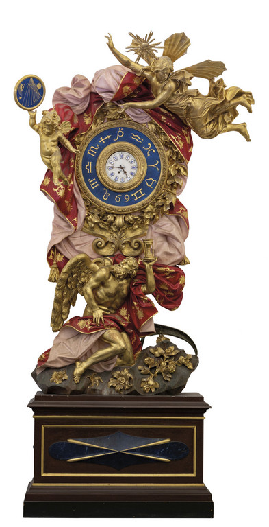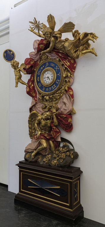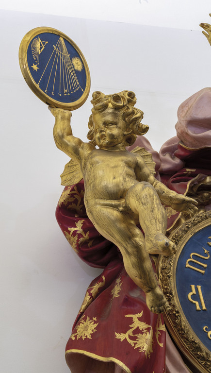 Monumentale orologio in legno finemente intagliato, laccato e dorato, nella parte inferiore una scultura raffigurante il tempo sorregge la parte superiore ove un drappeggio policromo porta al centro l'orologio, nella parte superiore figura alata e a sinistra un putto che sorregge una meridiana