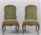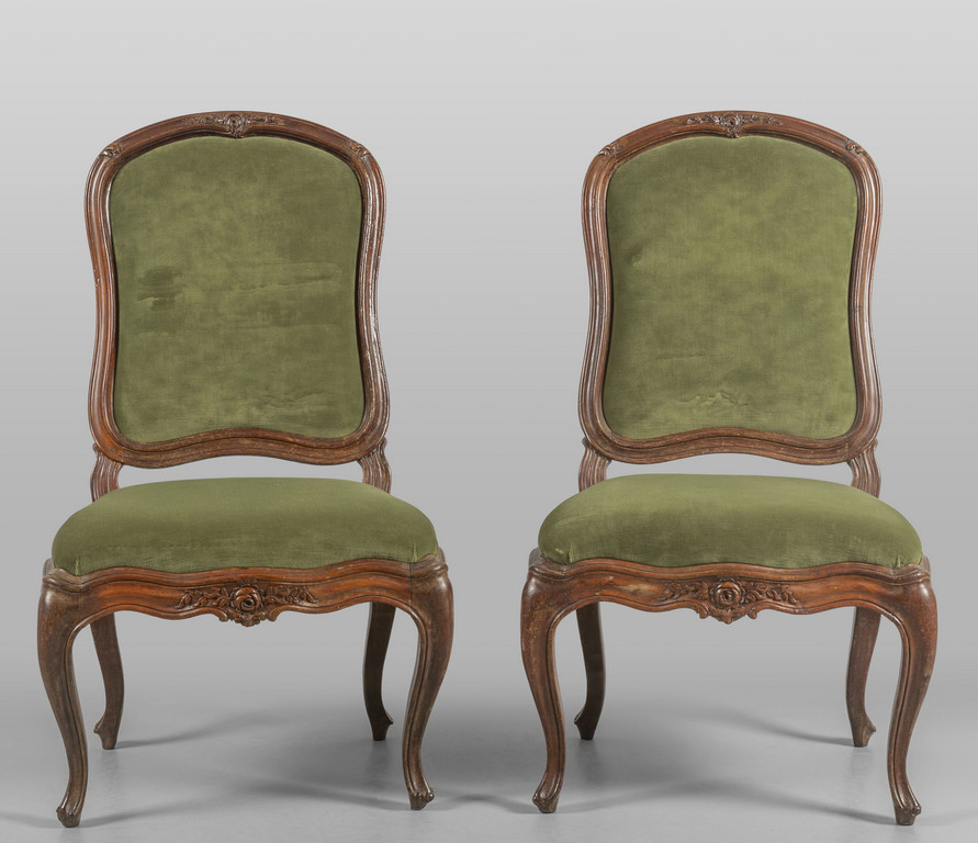 # Coppia di sedie Luigi XV in noce intagliato, cimasa con il motivo delle roselline riportato anche nella seduta, foderate in velluto verde, Genova sec.XVIII