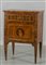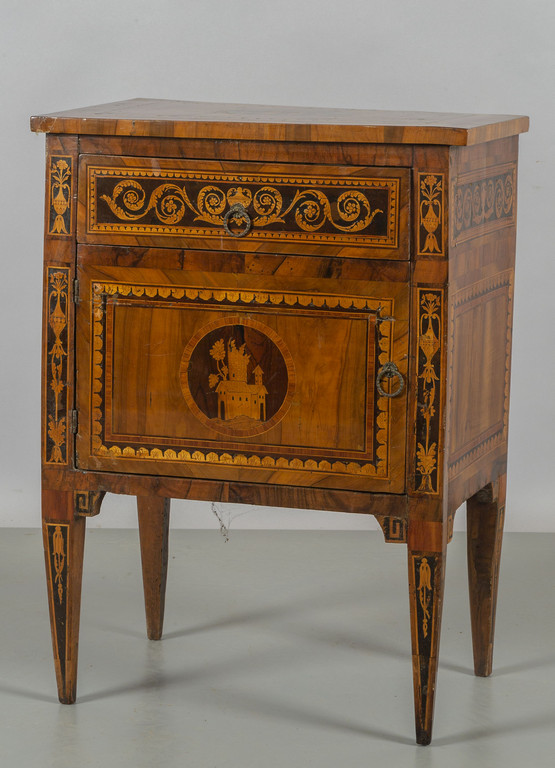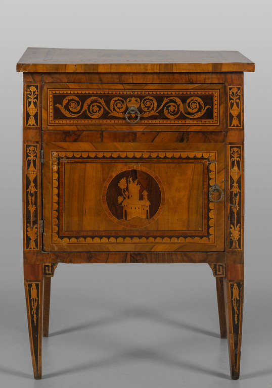 Comodino Luigi XVI ad un cassetto ed uno sportello, lastronato e finemente intarsiato a festoni con medaglione centrale, Lombardia fine sec.XVIII