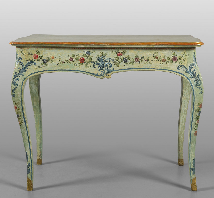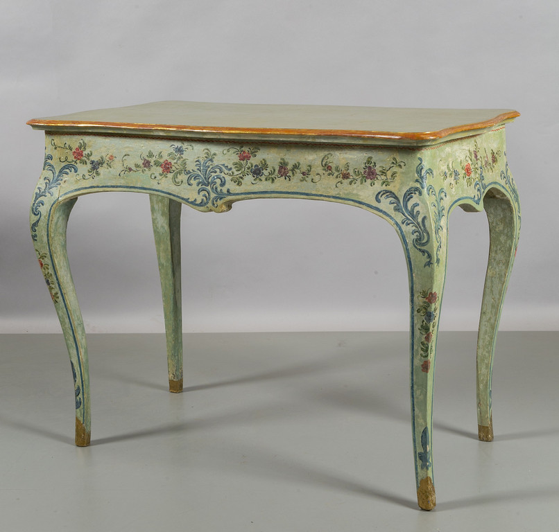 Tavolino Luigi XIV da centro in legno dipinto a fiori in policromia su fondo azzurro, Genova sec.XVIII