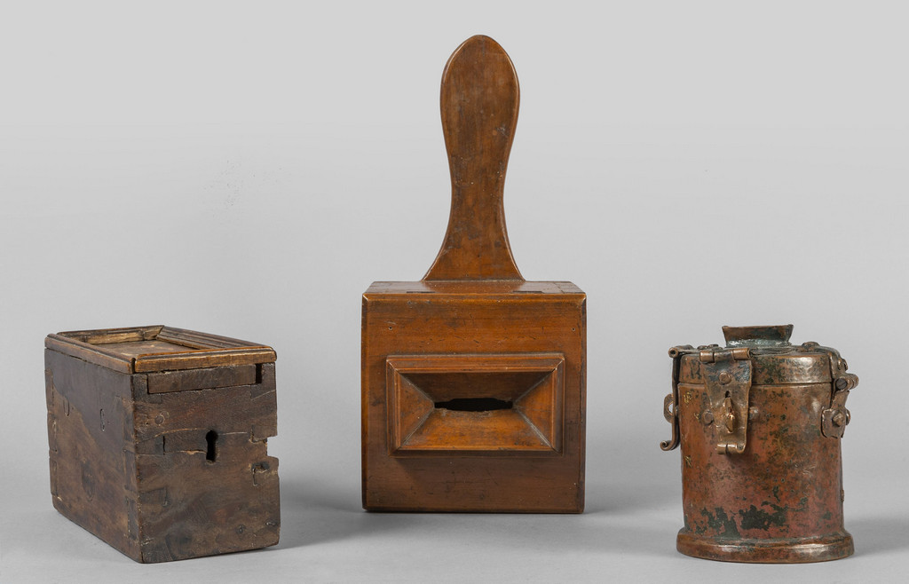 Tre elemosinieri di cui uno in rame a doppia chiusura