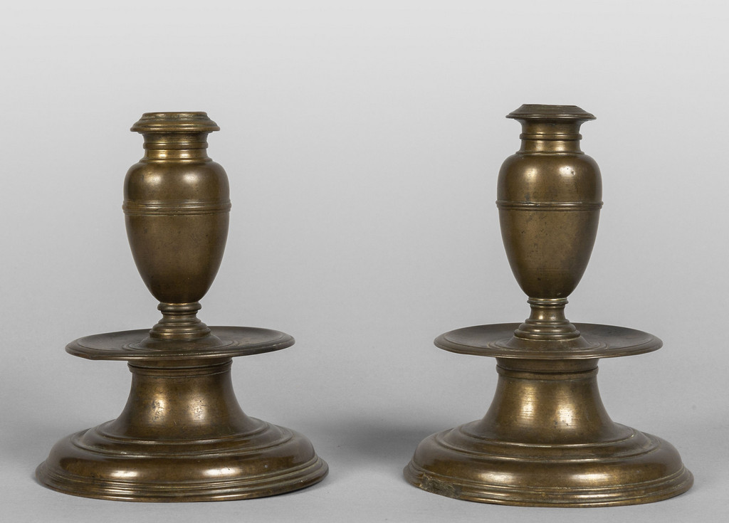Coppia di candelieri a panettone in bronzo brunito, Venezia sec.XVI