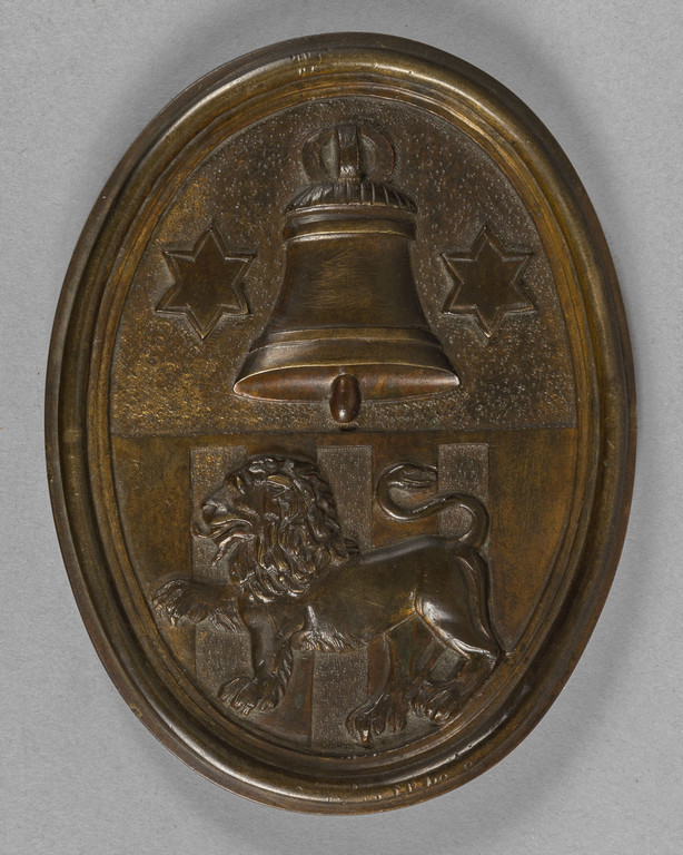 Leone e campana, ovale in bronzo brunito, Veneto sec.XVI