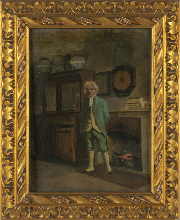 # "Gentiluomo in abito azzurro davanti a un camino" olio, sec.XIX
