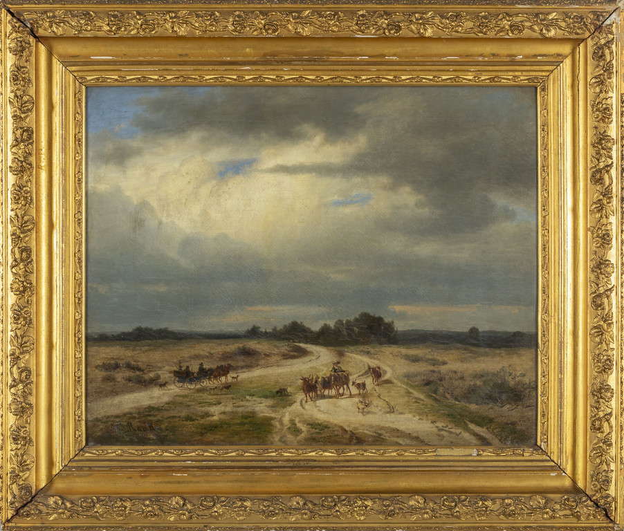 # "In carrozza tra i campi" olio, f.to in b.a sn., sec.XIX