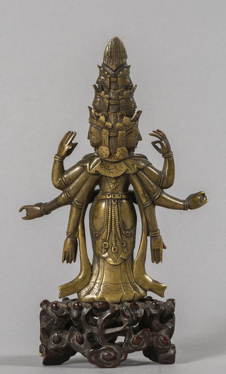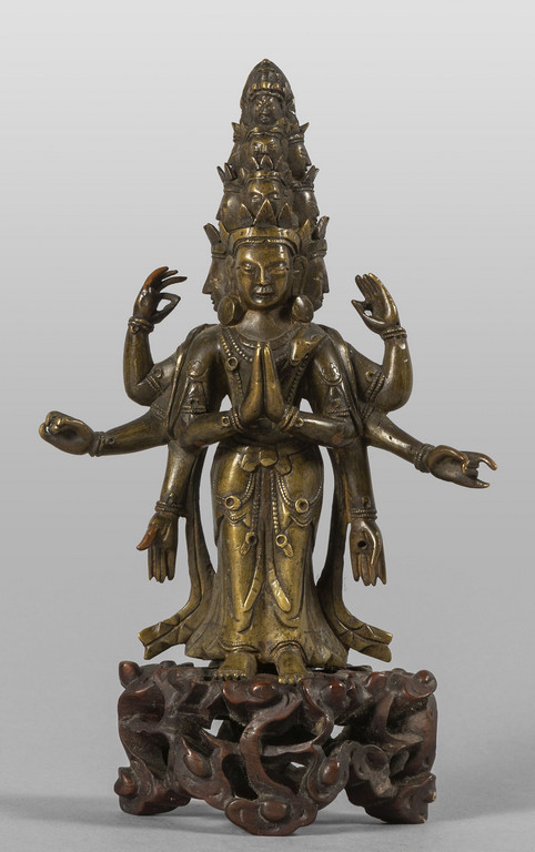 Divinità in bronzo con otto braccia e cinque teste poggiante su base in legno intagliato, Tibet sec.XIX