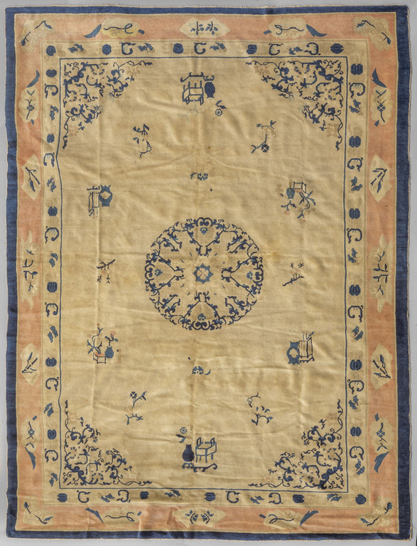 # Tappeto cinese a fondo crema e rosa decorato in blu con oggetti stilizzati, sec.XIX