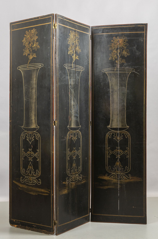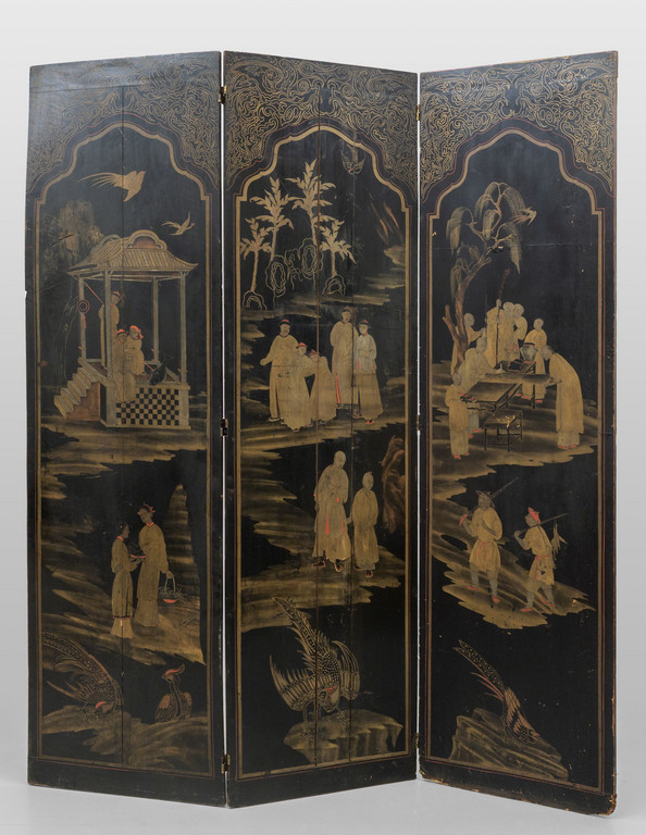 Paravento in lacca nera e oro decorato con scene di vita orientale, Cina sec.XIX