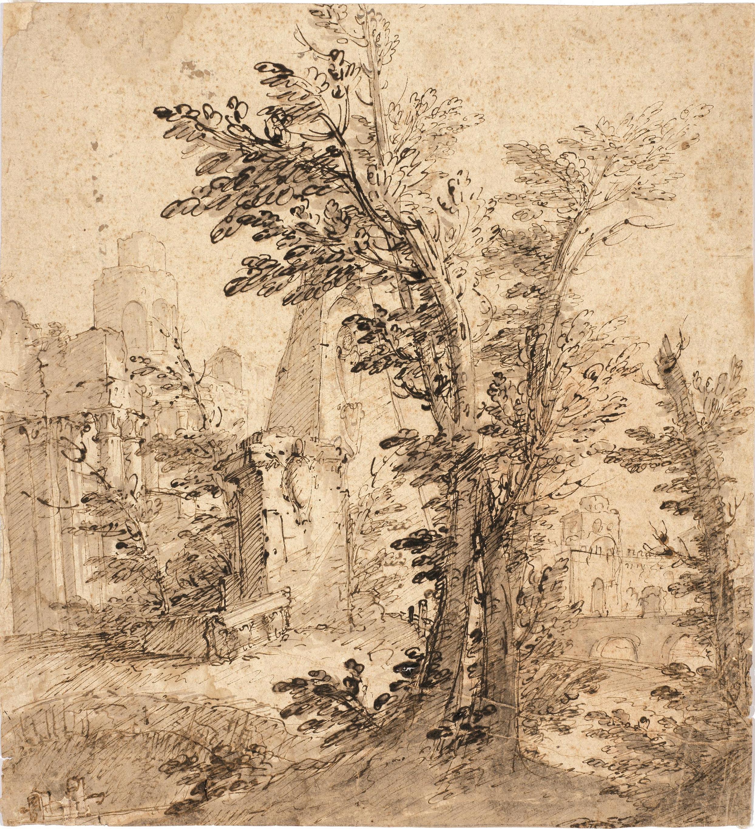 Penna e inchiostro bruno e acquerello grigio su carta vergellata. mm 296x273.